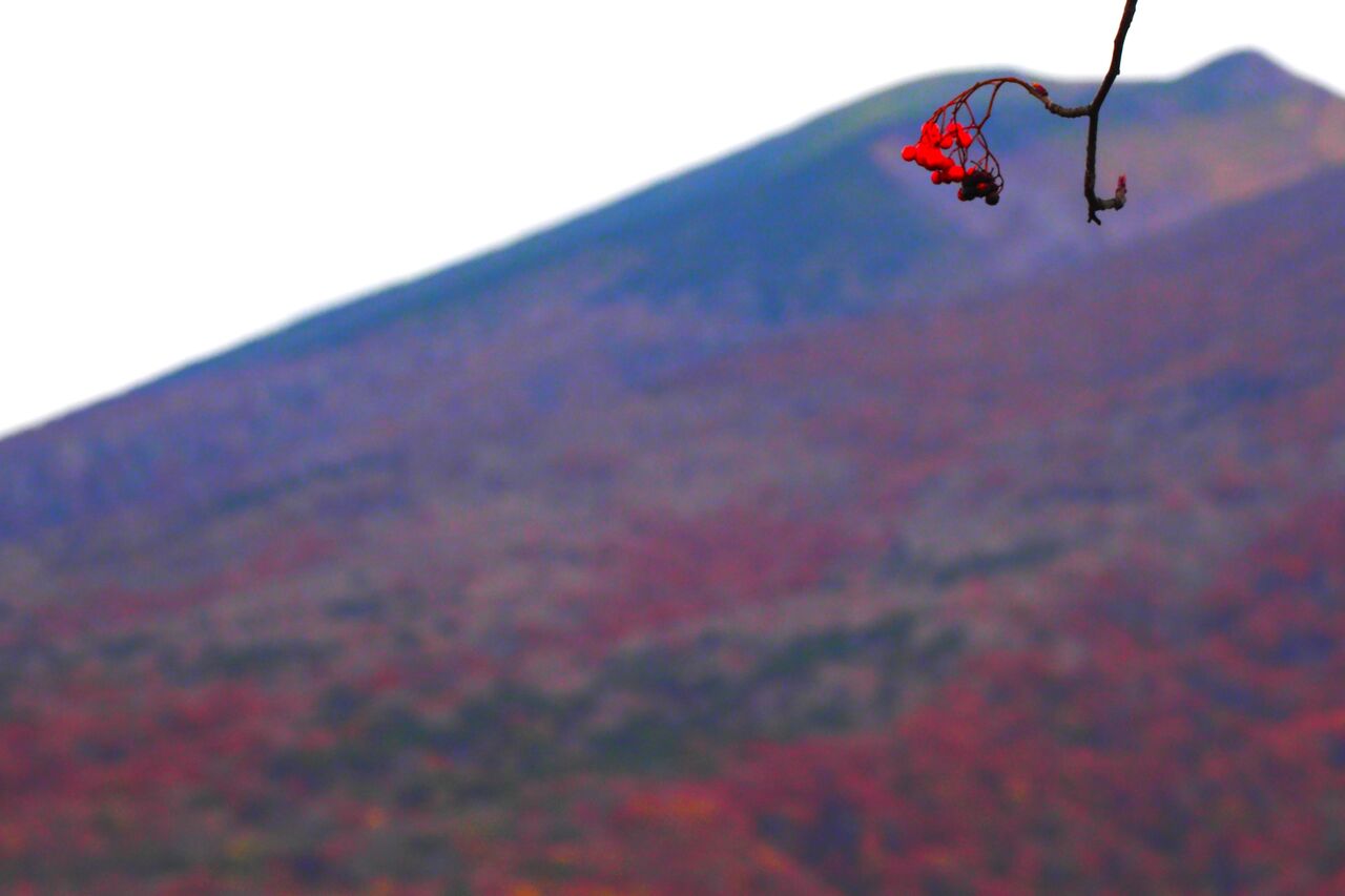 不忘山の山肌を背景に、ナナカマドの実がポツンと真っ赤っかで小さい秋見つけた。
