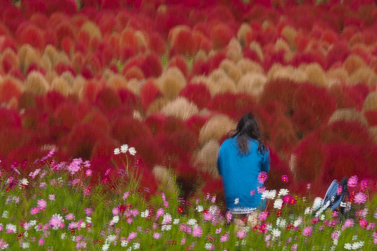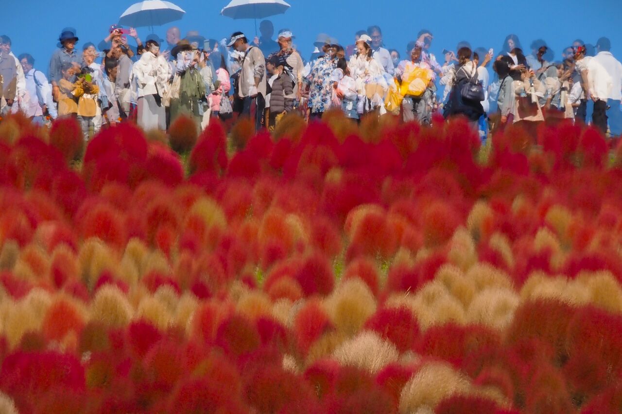 周りに人がたくさんいるのに、それを避けてコキアとコスモスの花を撮るのは大変です。
