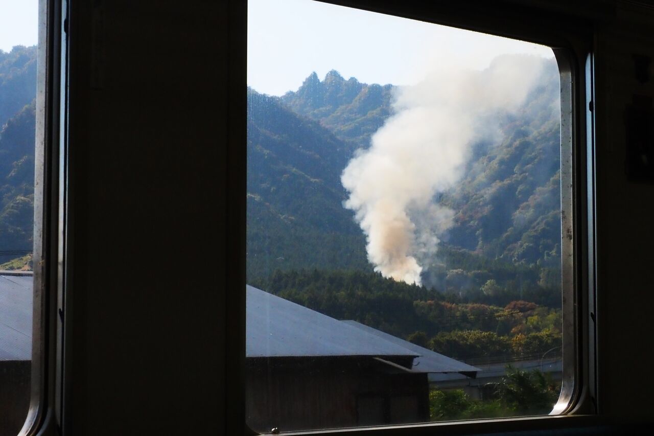 鉄道資料館の屋上が展望スペースになっているので、余った時間に階段を上がって行って、軽井沢方面とつながっている高速の高架橋を眺め、振り向いたらまっすぐ上空に登っていく黒煙。