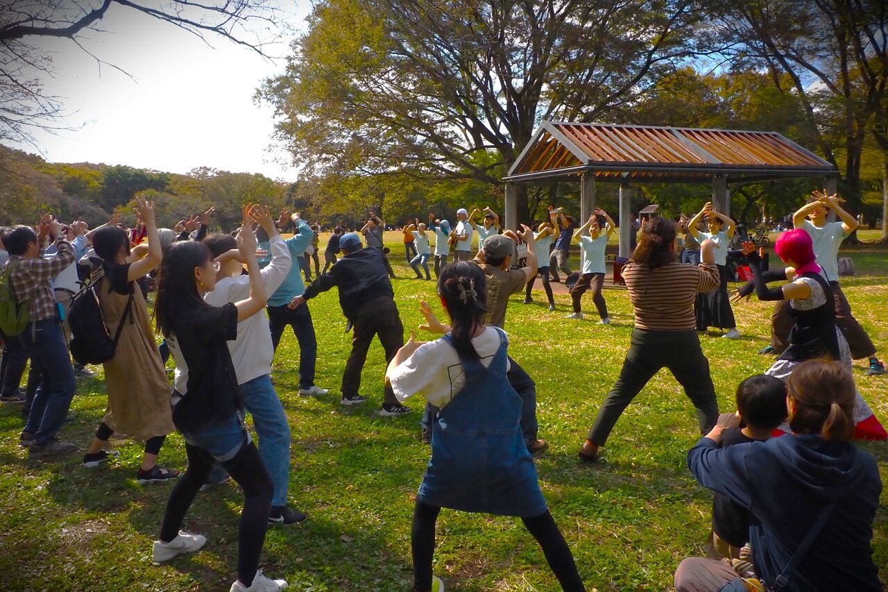 これは定番のミーティング時の踊り、たしか「ギンギンギラギラ夕日が沈む」の振りですな。