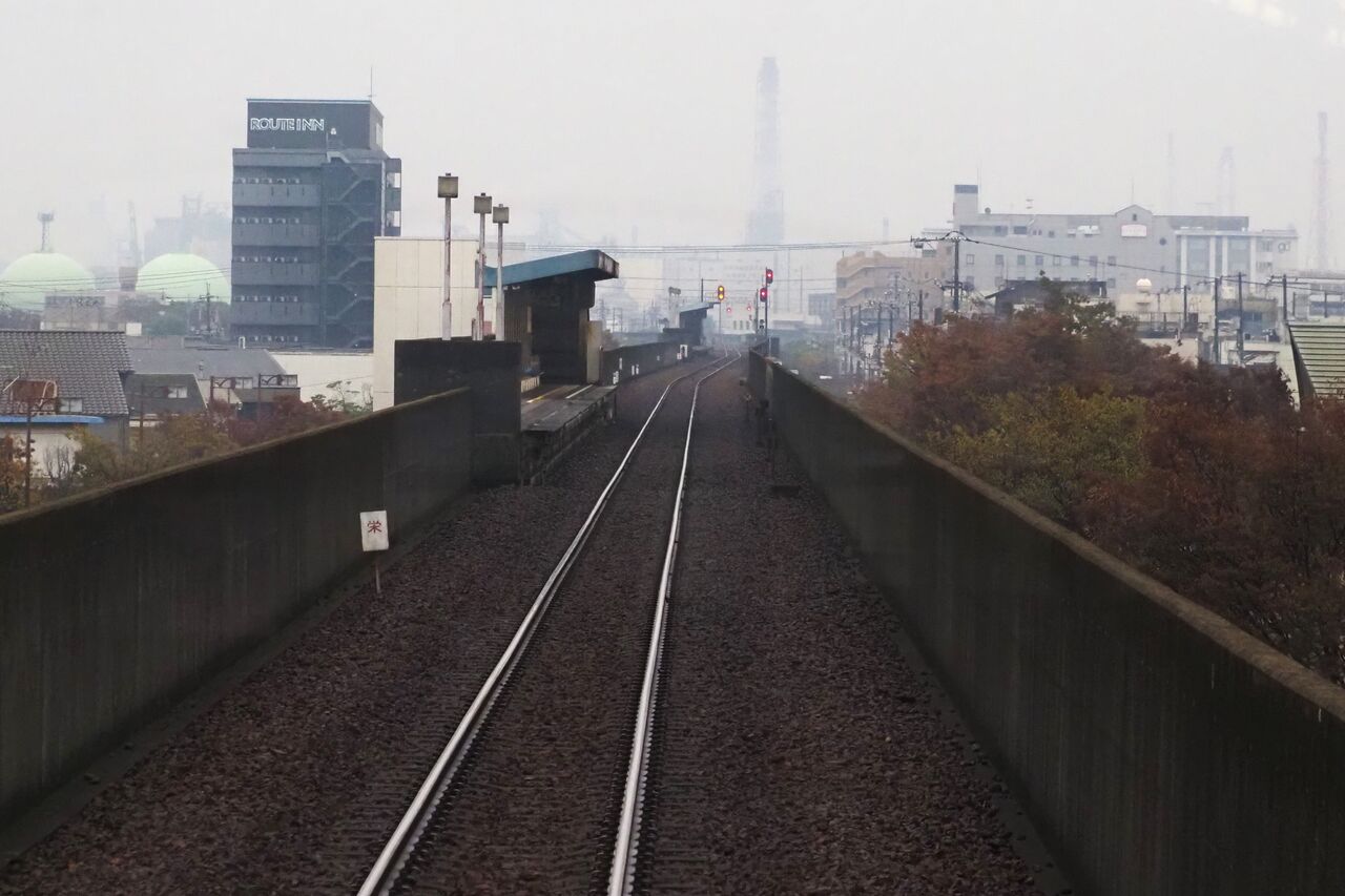 水島工業地帯は日本を代表する重化学コンビナートですが、この路線はそこに通勤する人たちと、コンビナートの貨物を運ぶ路線で、途中からはコンビナートに向けて高架の線路がほぼ直線的に延びていて、途中にポツリポツリと小さな駅が並んでいます。