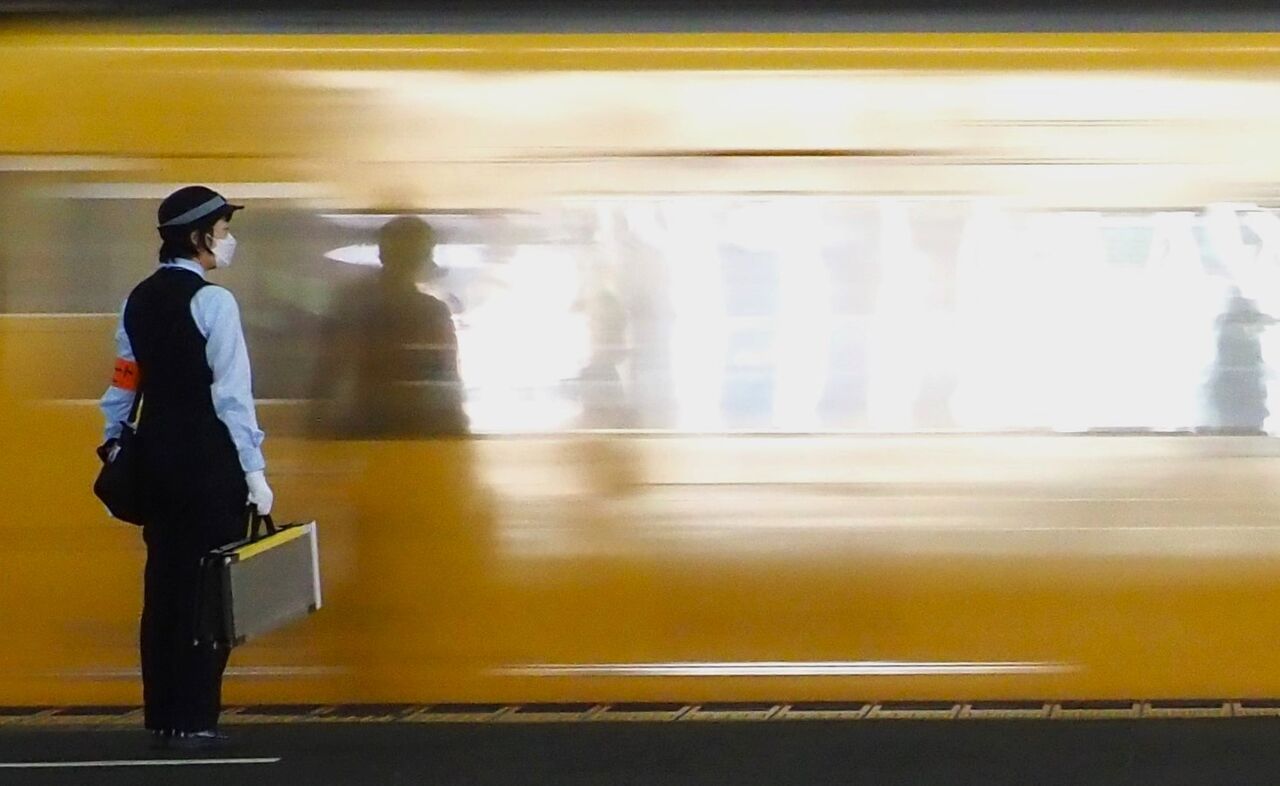 乗務員交代のアテンダントさんが立っていたので、シャッター速度を遅くして列車の動感を表現して撮ってみました。