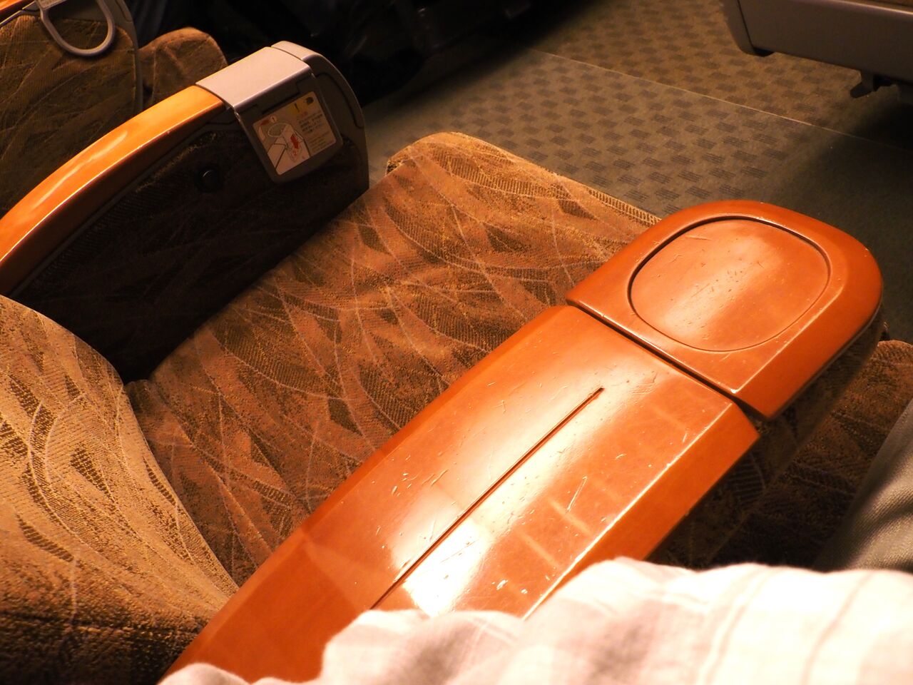 一人で乗って隣に他人が座ると、間にある肘掛けはどっちの物争奪戦が心理的に勃発しますが、「さくら」ではご無用、ちゃんと中間肘掛けは双方で使えるように境界線が描かれています。