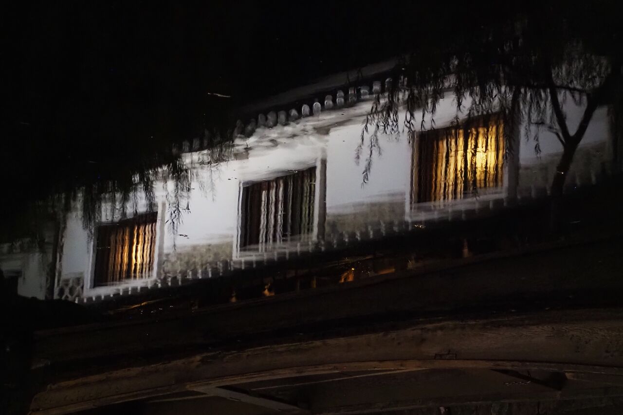 食後の夜の美観地区散歩を終えて裏門から戻るとき、店を閉めたスタッフが館内に戻るのを背後からパチリ、明日の予定を考えます。