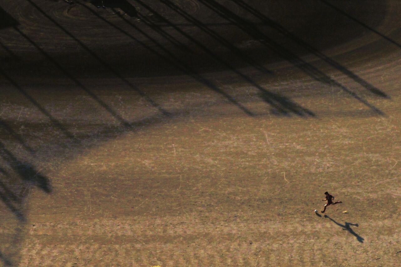 ふと下を見ると高校のグランドに、ネットを支える支柱の影が西日で長く延びています。