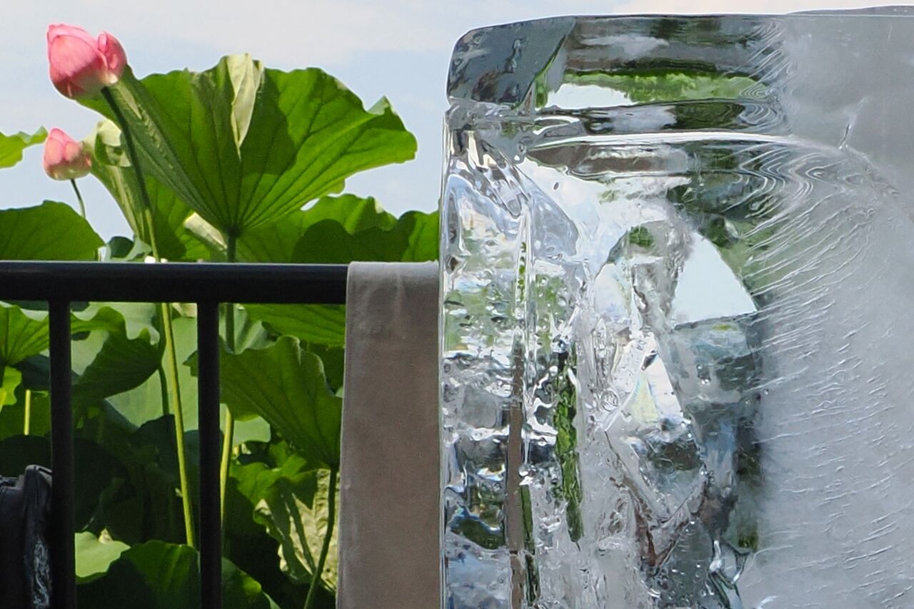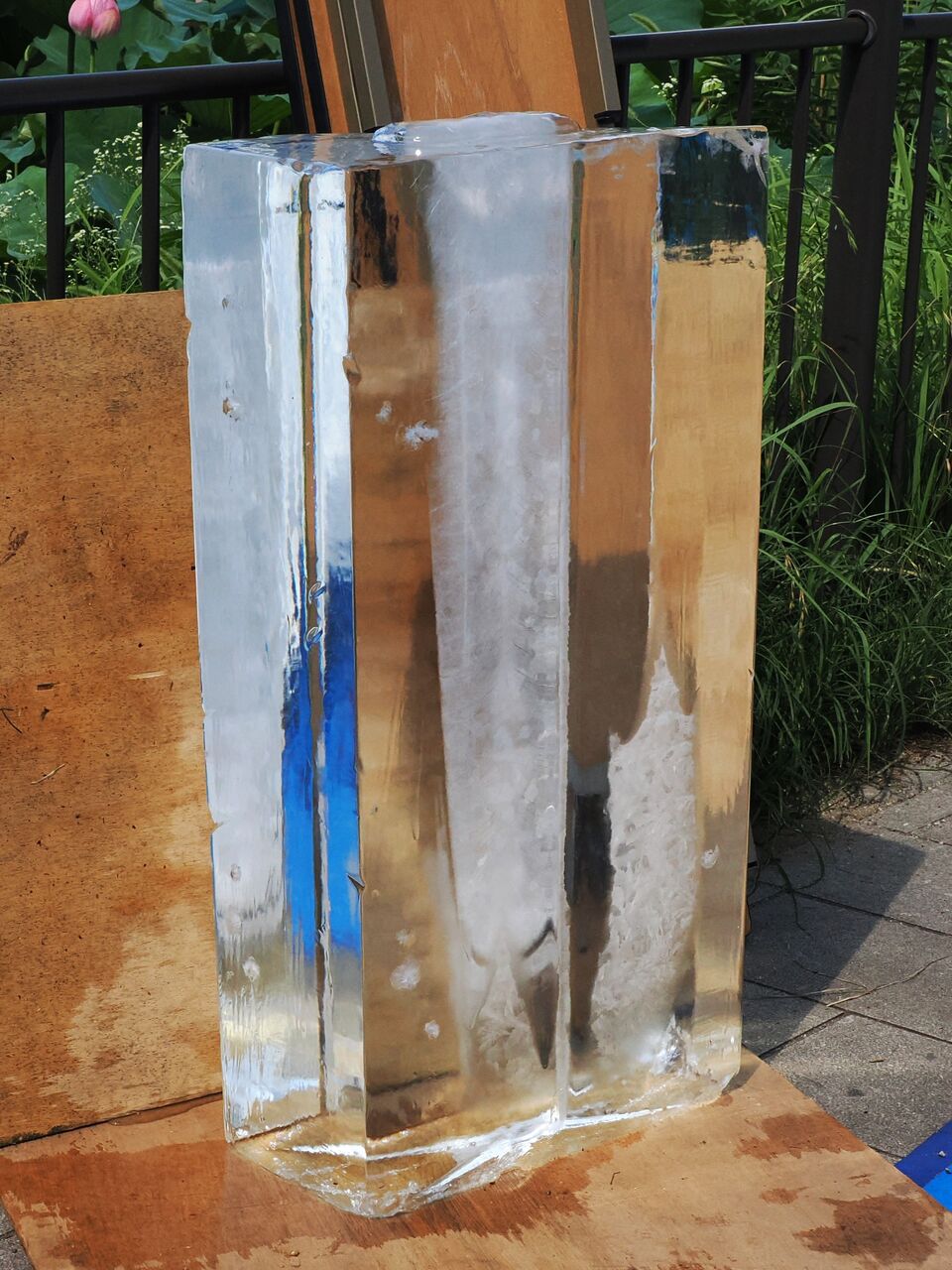 氷は36℃の気温の中で炎天に晒されているのでどんどん融けてきて、作品は時間との勝負です。
