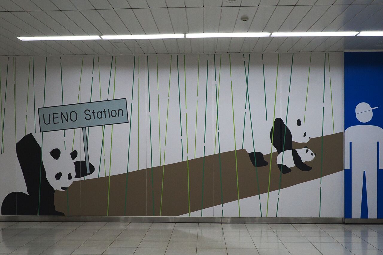 上野といえばやっぱりパンダ(まだ見たことないけれど)というわけで、トイレわきの壁にも上野公園までの坂道とパンダの絵。