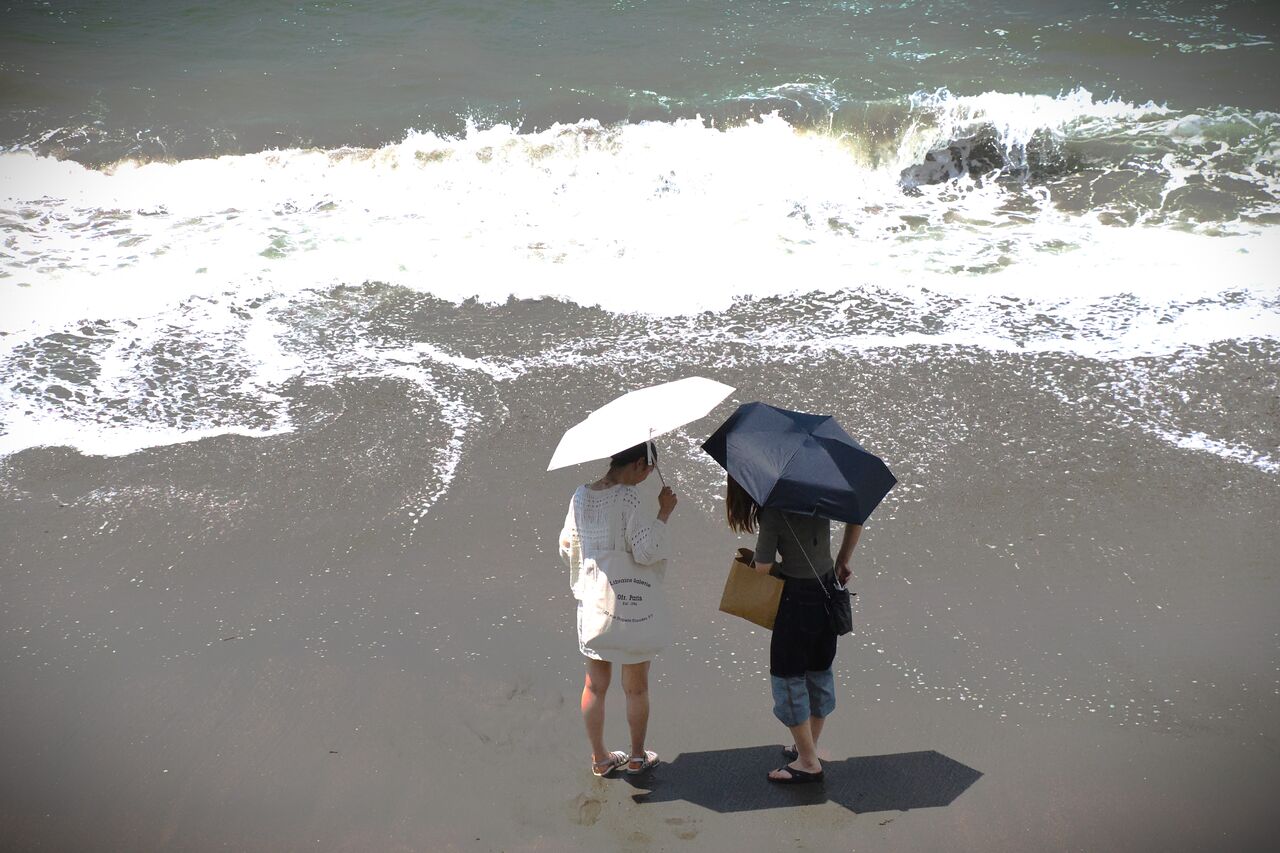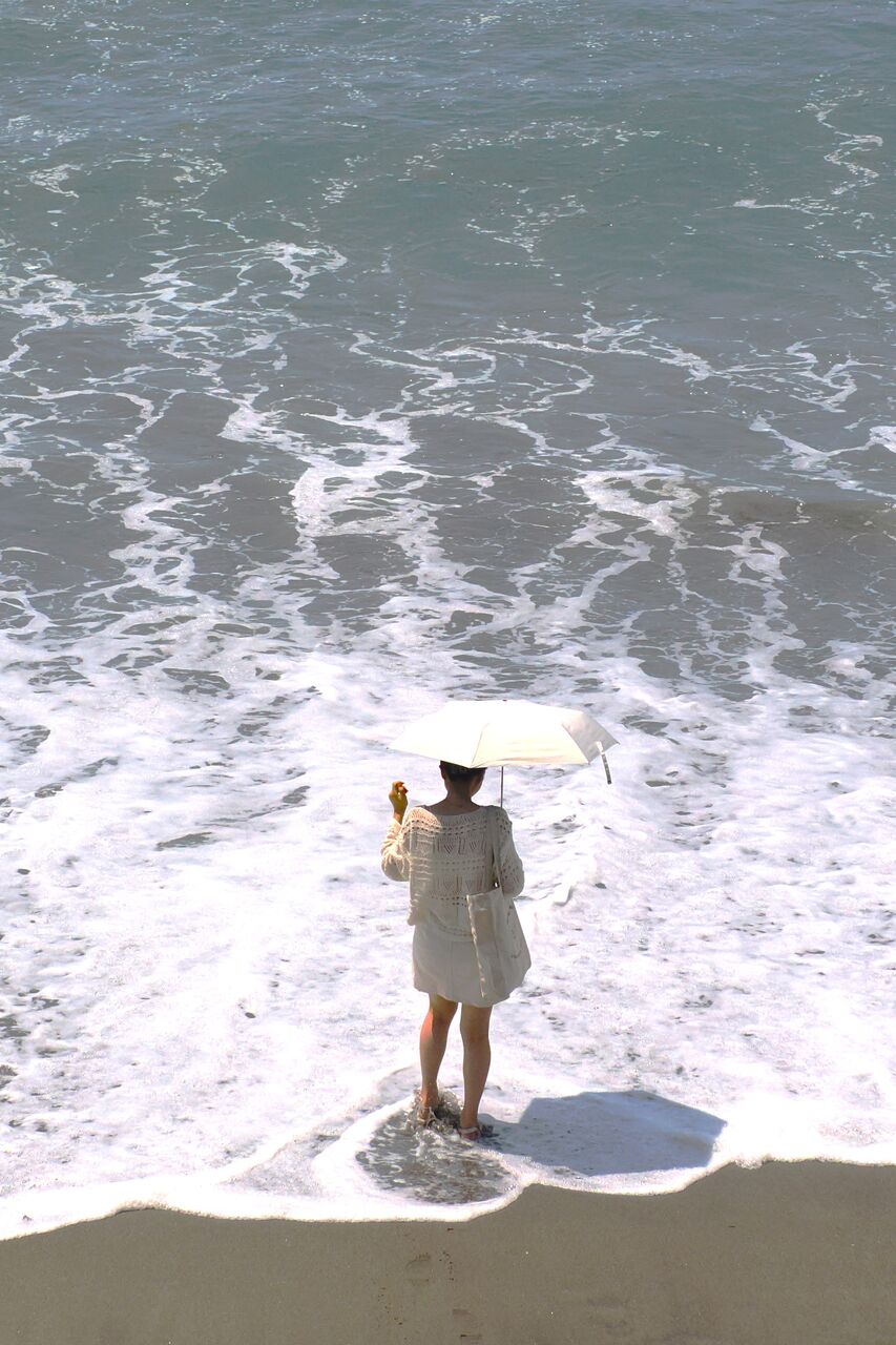 白い服に白い日傘に白い波の泡、なかなか写真になるじゃありませんか。