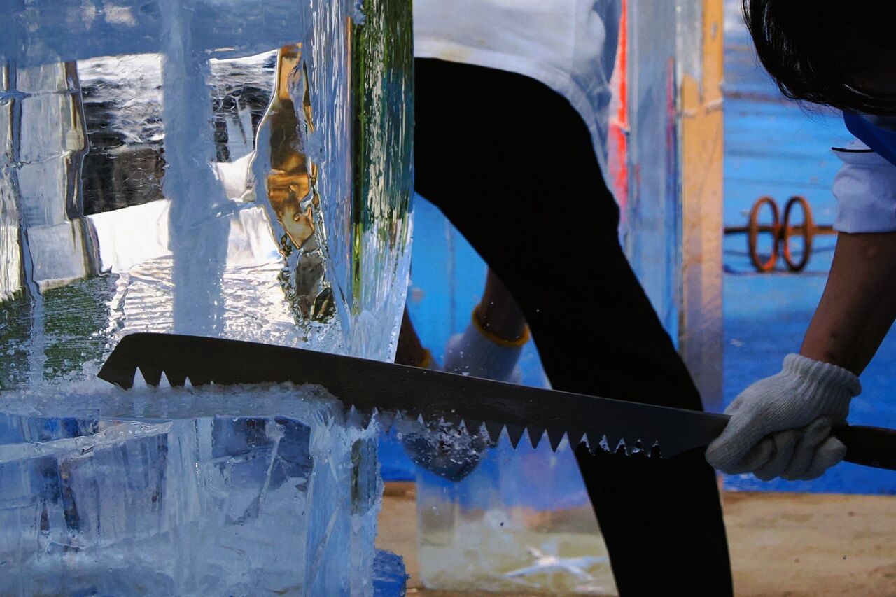 氷の彫刻は、まずノコギリで氷を切る所から始まります。