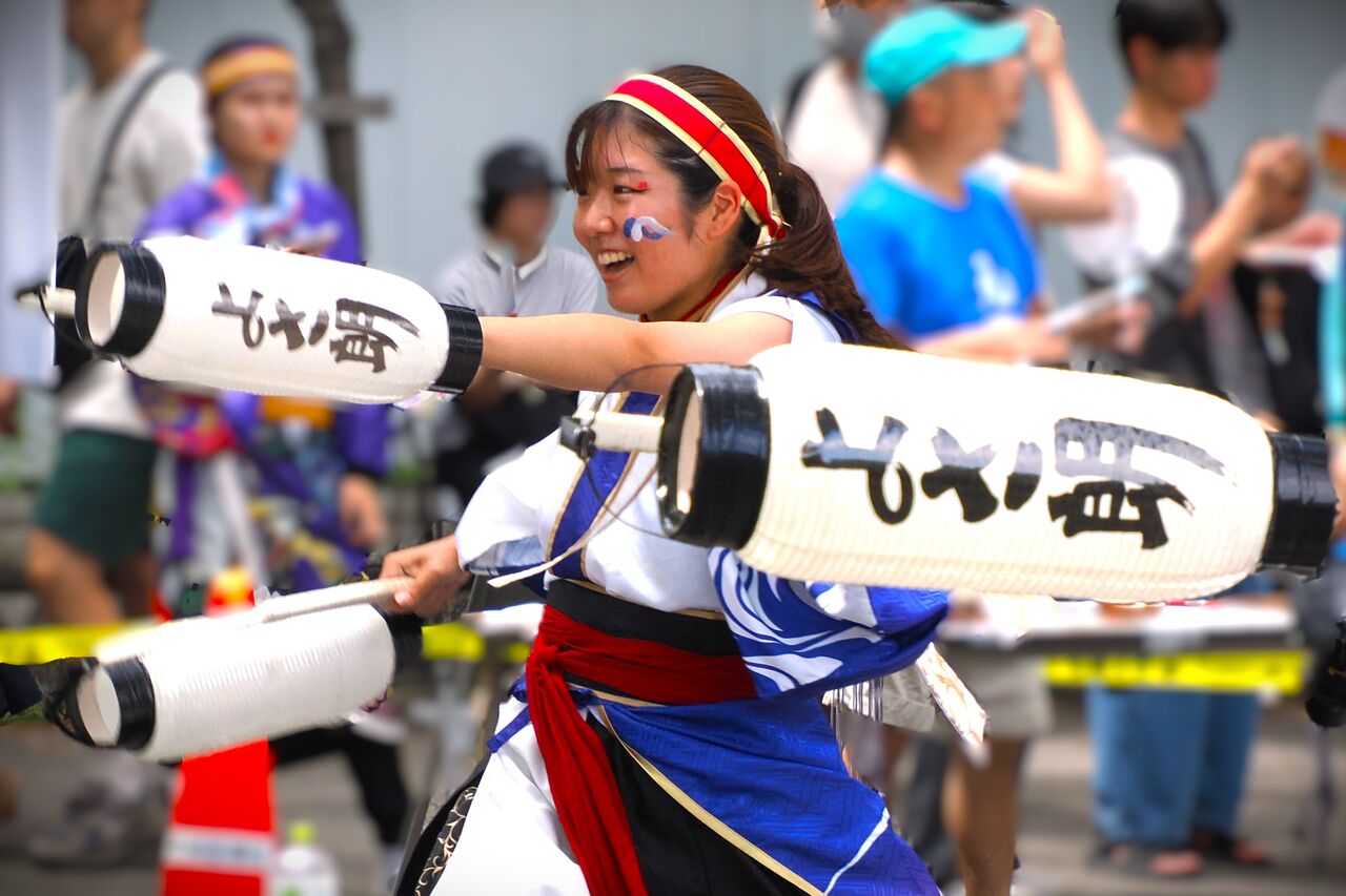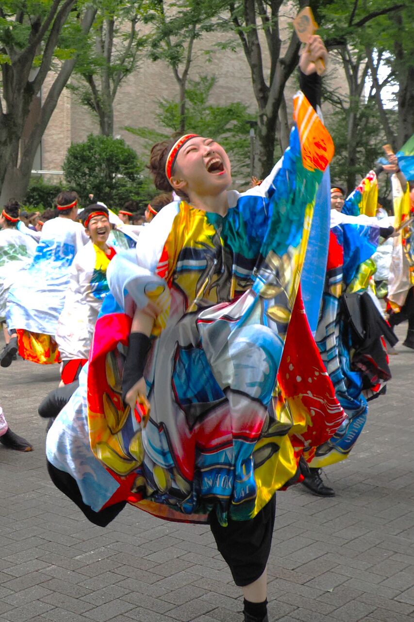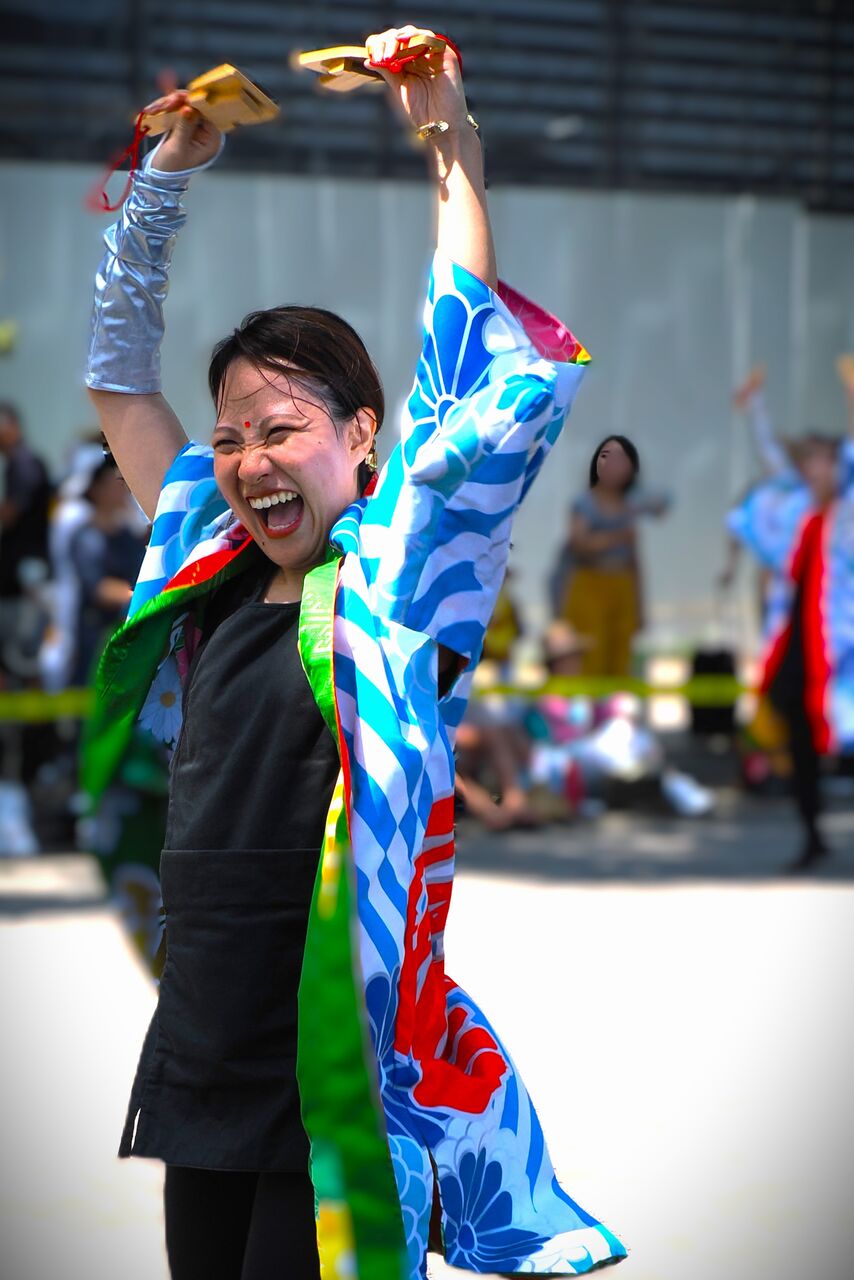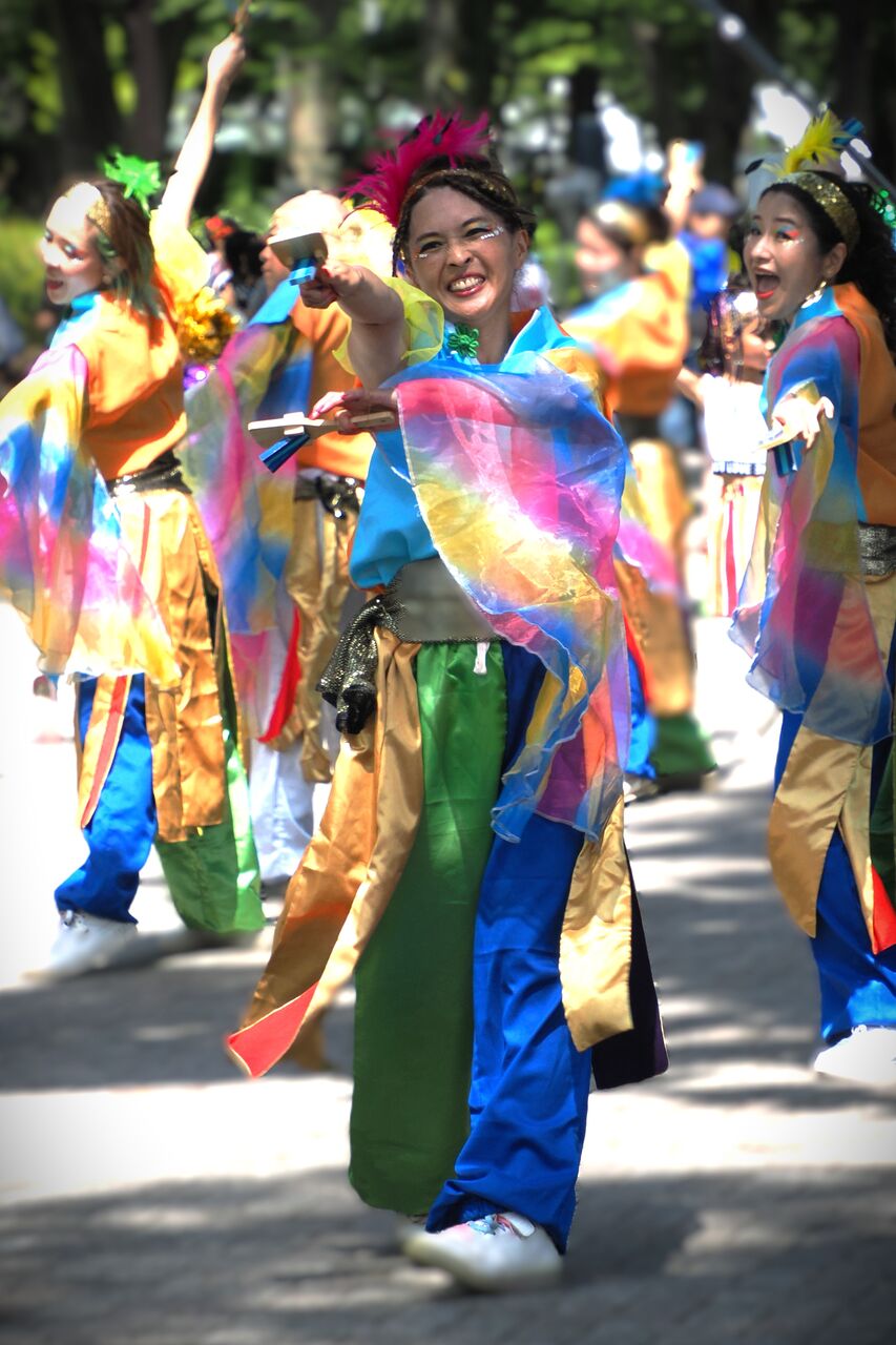 ヨサコイのようなイベントではいつものようにまずは美人センサーが作動するのですが、原宿ではイベント名に元気祭とついているので、元気な笑顔センサーで反応した踊り手をアップしてみます。