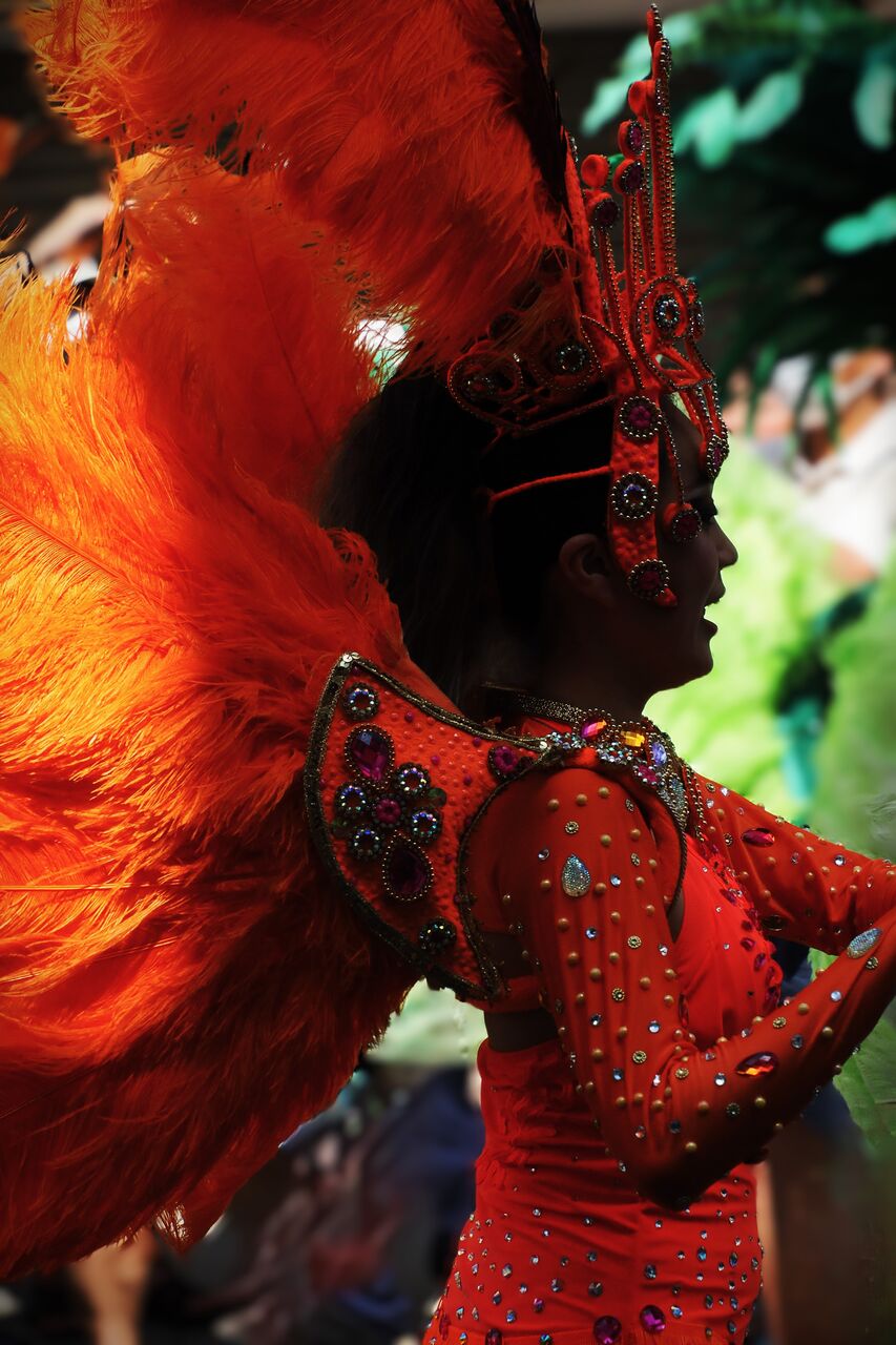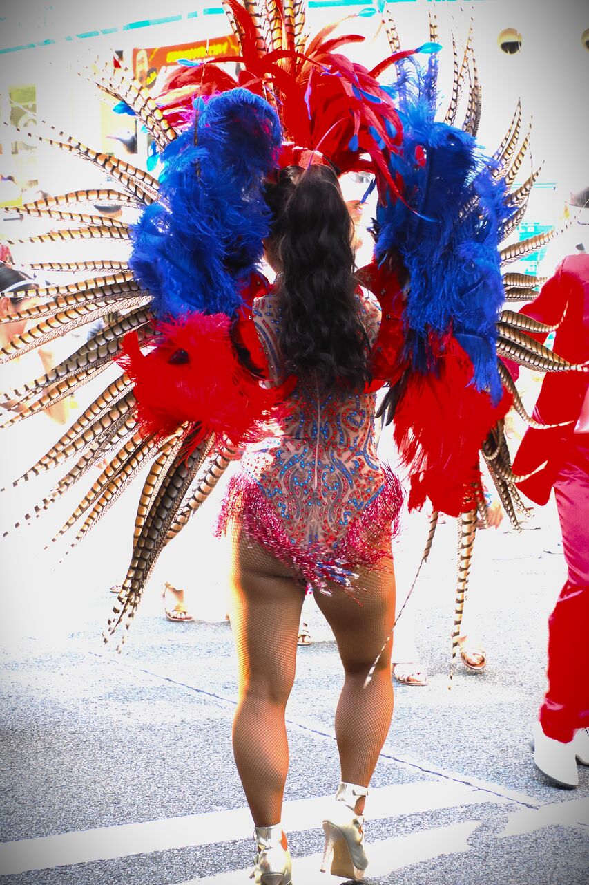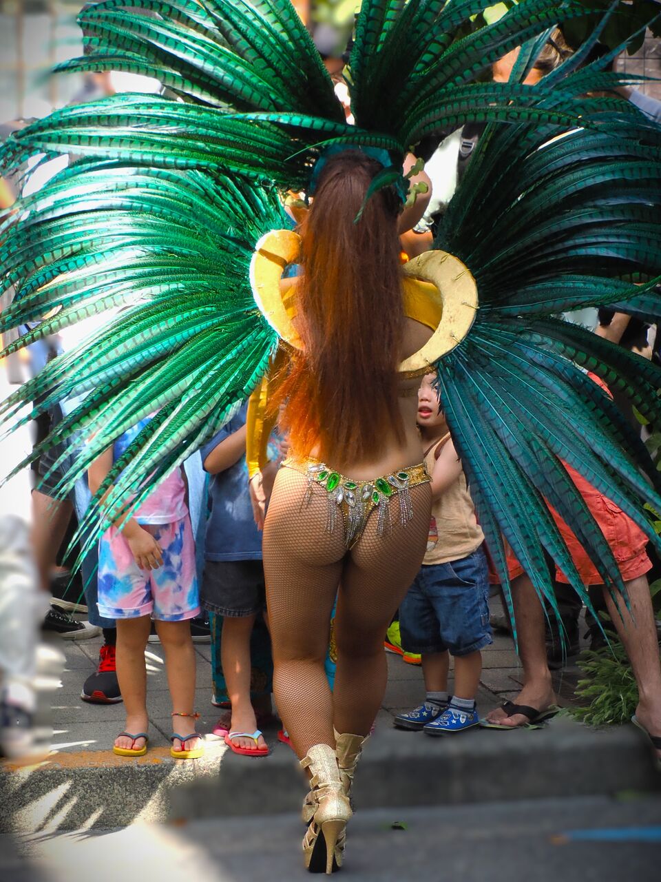 最初の方のチームのダンサーはカメラが正面から撮りたくないと反応していたので、真後ろから豪華な羽根飾りを主役にパチリ。