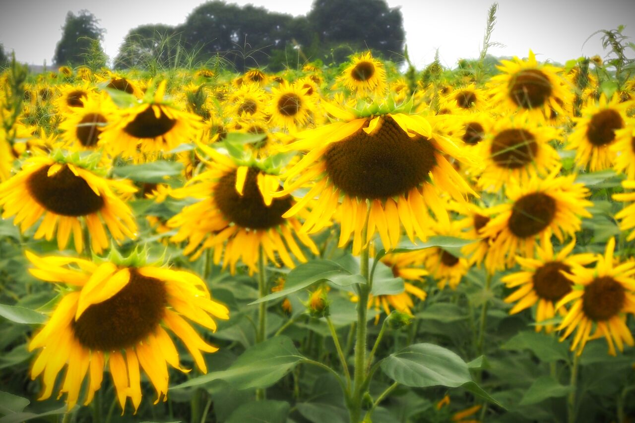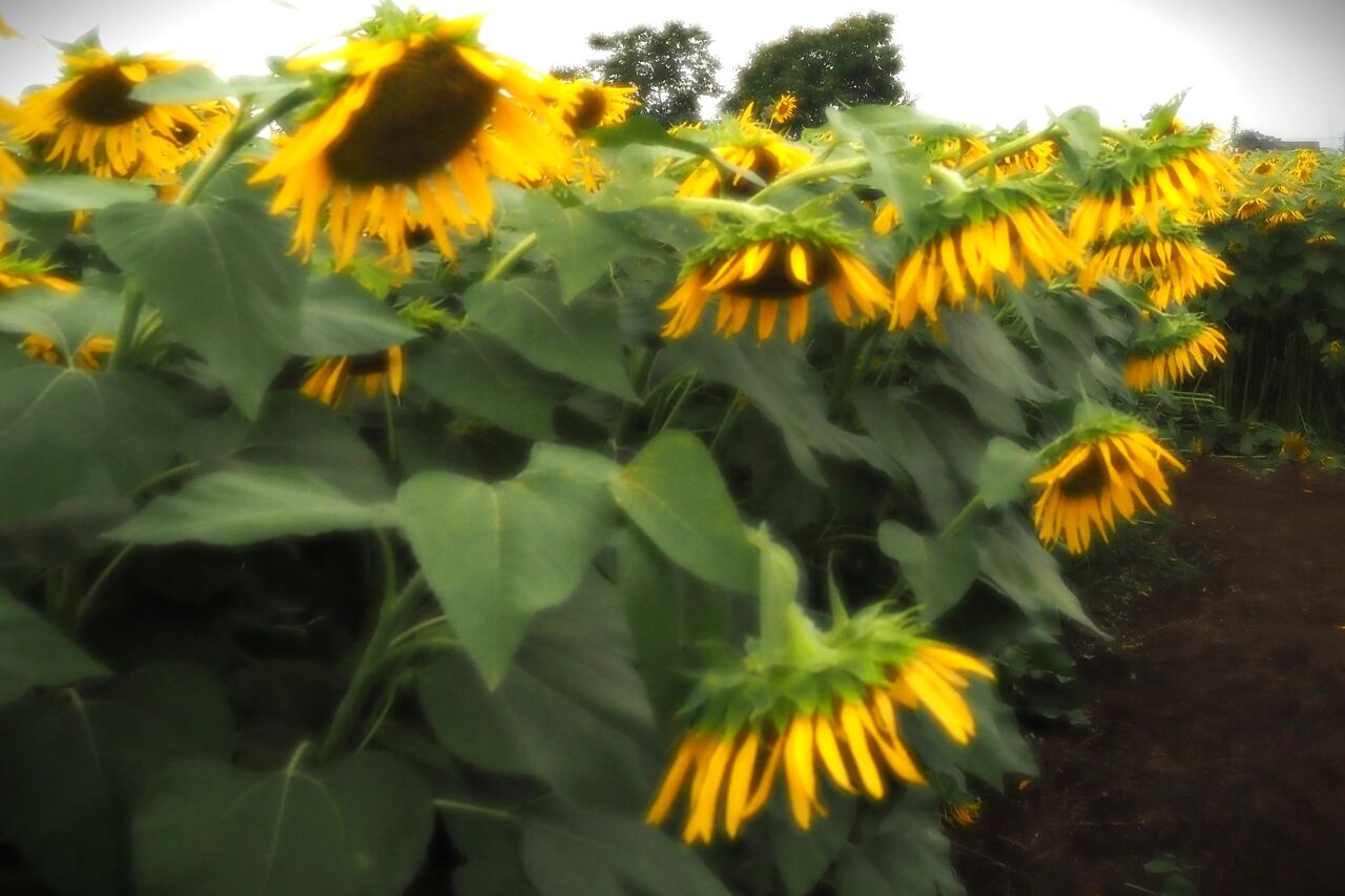 晴れていればヒマワリが太陽に向かって元気に花開いているはずですが、どうやら前夜に雨が降ったようで空はどんより曇り空。