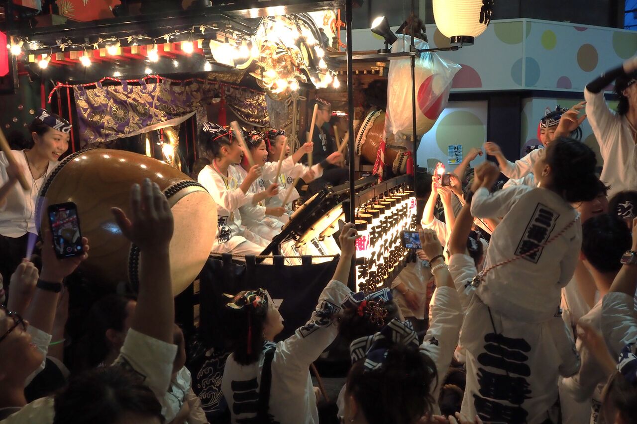 昔からの商店街のアーケードの通りにあるのですが、ちょうどその店の前の交差点で4台の山車が集まってお囃子を鳴らして盛り上がっています。