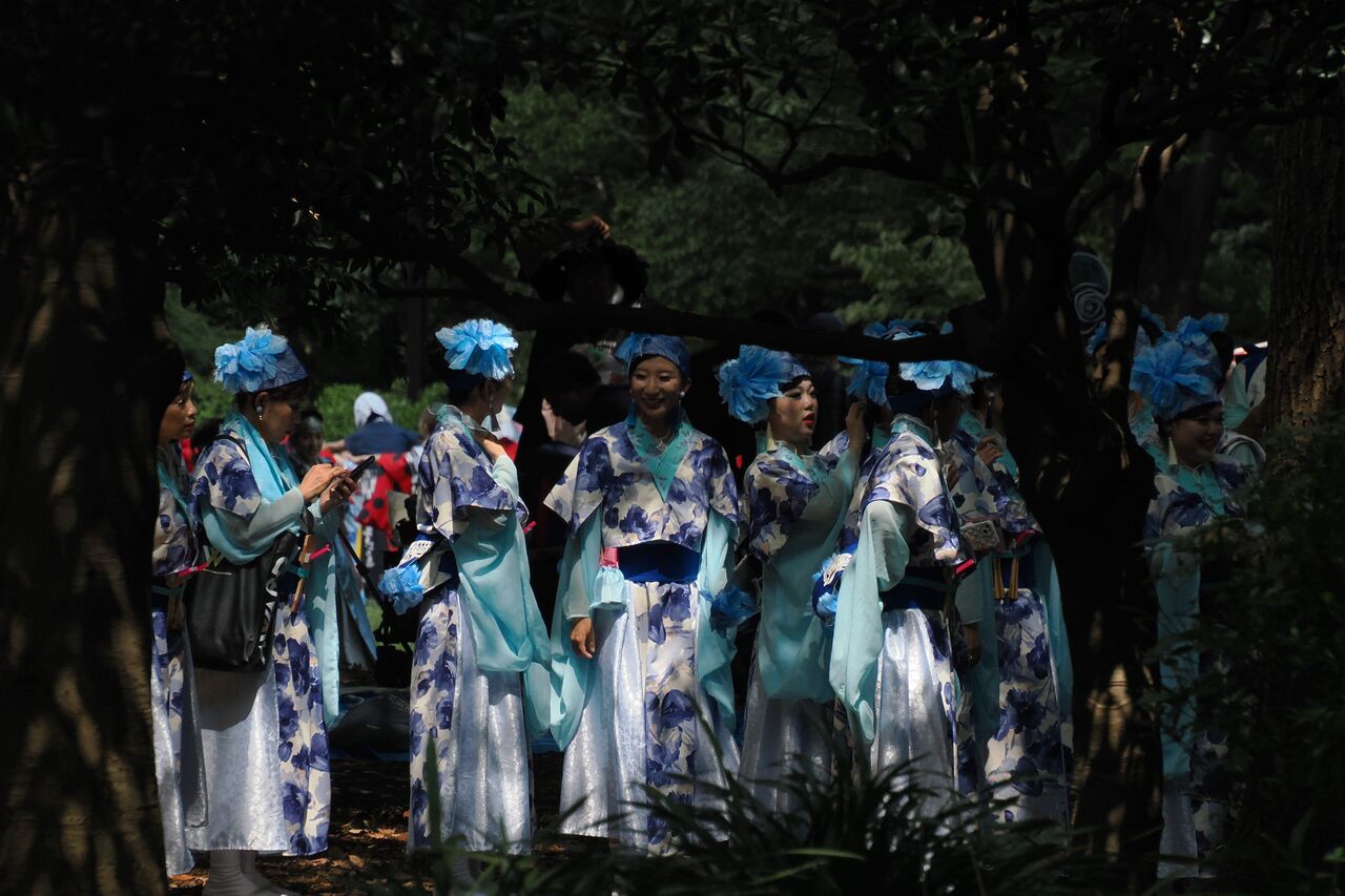 新しくなった原宿駅から代々木公園の前を通ると、たくさんのチームが公園内で演舞の準備をしています。