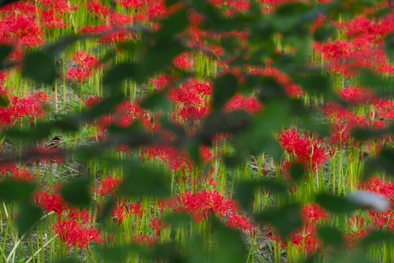 木々の葉の間から彼岸花の赤を覗いてみました。