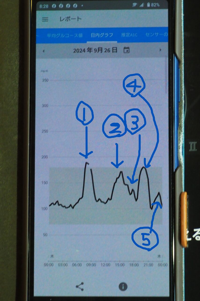 写真のグラフの①が朝食後の山。②が昼食後の山。④が夕食後の山で、③の小さな山は夕食前に1個食べたスモモです。スモモ1個でも体は素直に反応します。