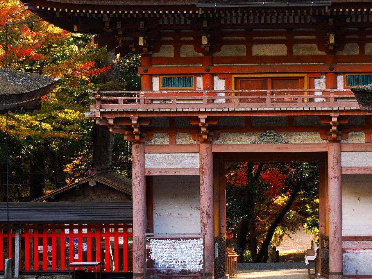 やはり本殿は国宝ですが、特に周りに紅葉もなかったので撮らずに振り向いて、楼門越しに外の景色を撮ってしまいましたが、この日は12月4日で今年はまだまだ緑のモミジも多かったのです。