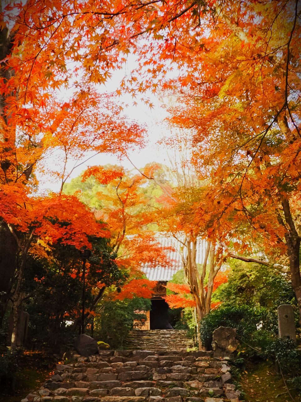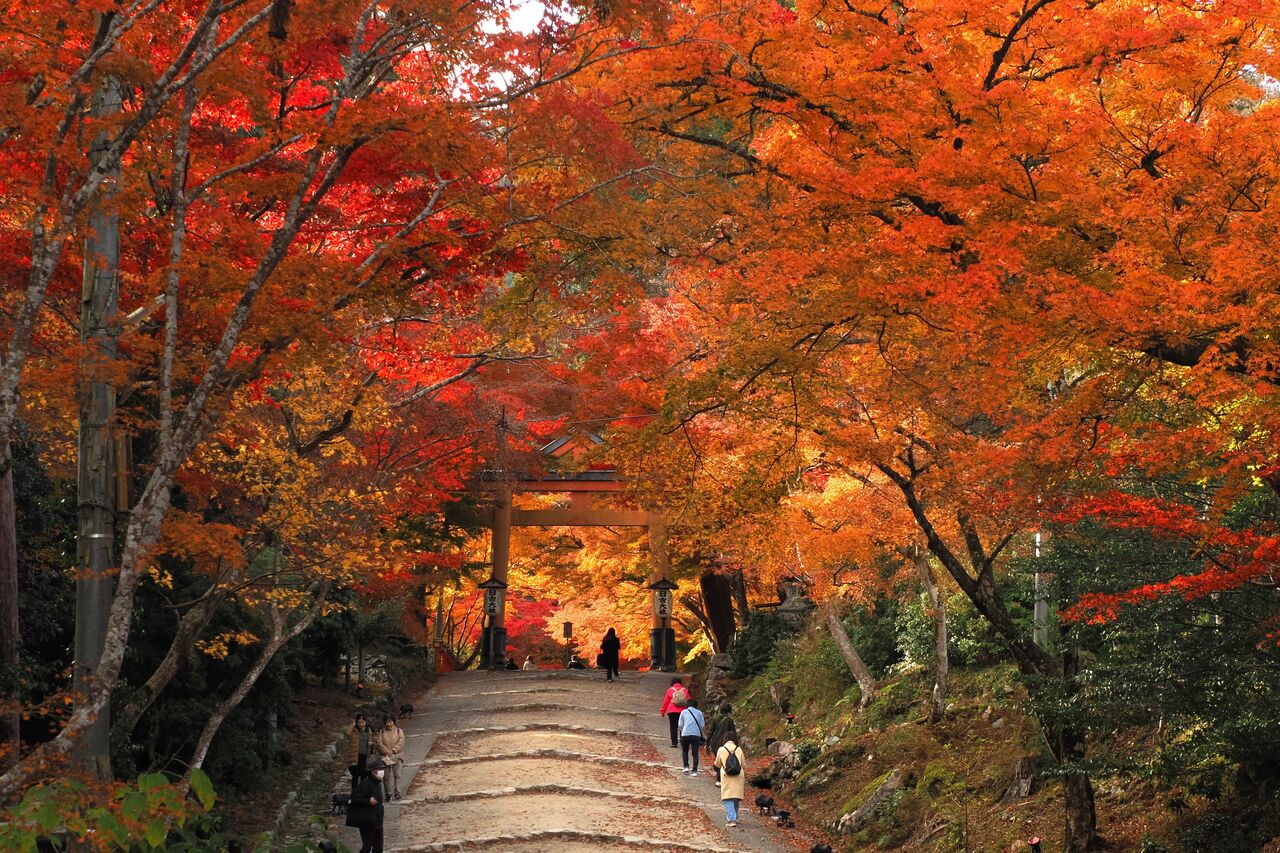 いわゆる紅葉の穴場としてインスタなどで紹介されているみたいですが、確かに拝観料を払って参道の階段はなかなかですが、この日はまだ緑のモミジも少し残っていて、参道を埋めるような散り紅葉はまだまだ先です。