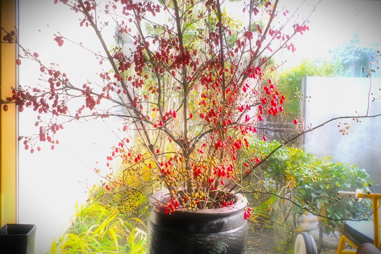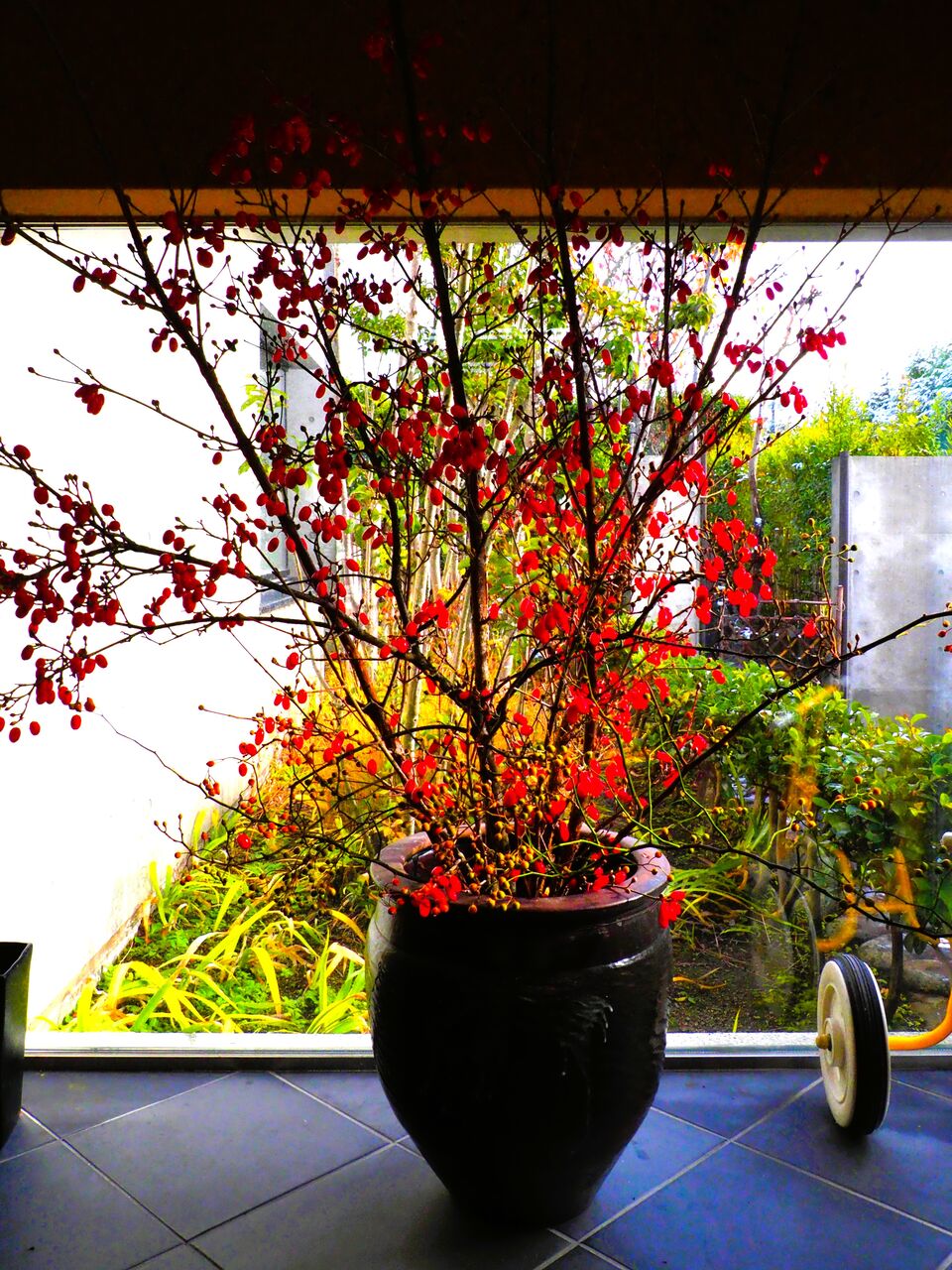 いろいろ枝をいじるとせっかくの赤い実がすぐ落ちてしまうので、太い枝だけノコギリで切って玄関の壺に投げ入れました。