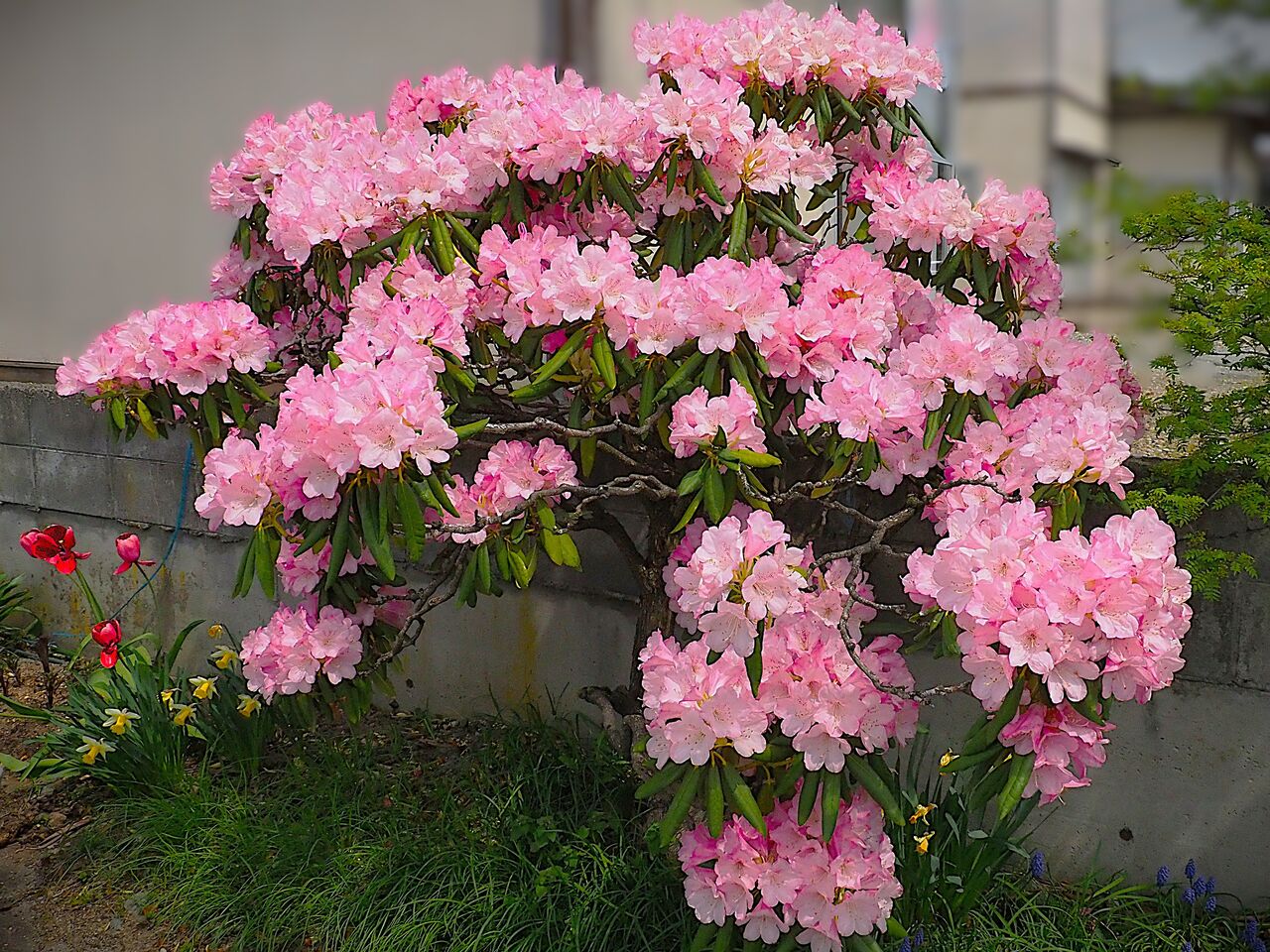 その店の駐車場のブロック塀の所に、とても見事は石楠花が2株、毎年花を咲かせます。