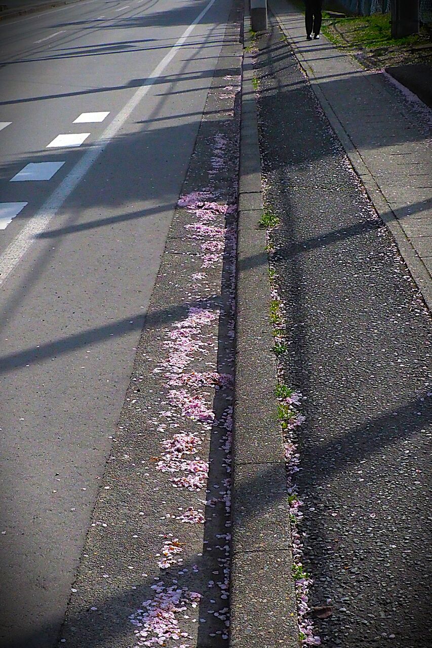 昨日の朝、ゴミ捨てのために外に出たら、道路の端が細いピンク色の帯。