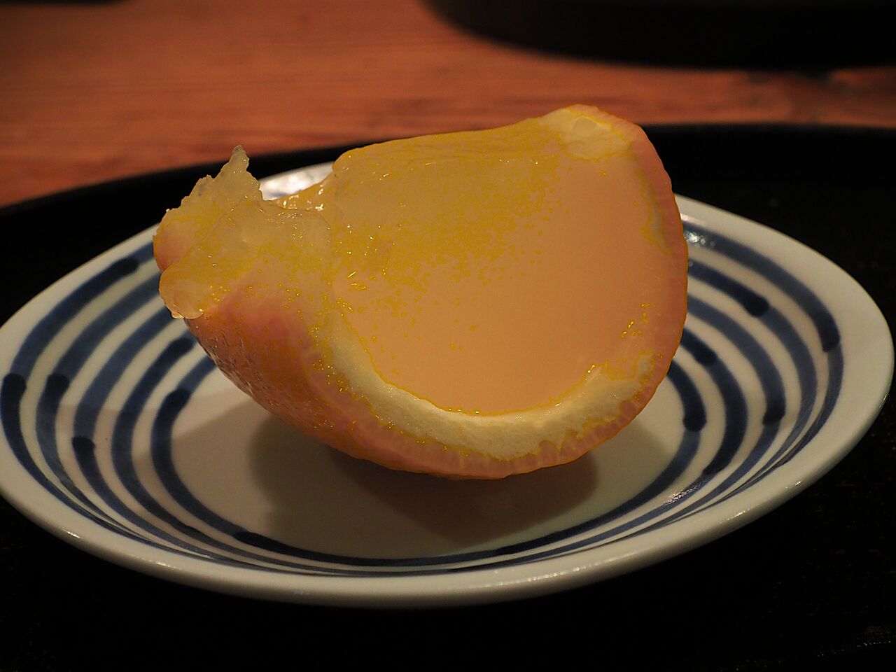説明書きによれば、山口県萩の夏みかんを使って、皮を傷つけないように竹べらで中の小袋を取り出して、そこに小袋を絞った果汁と寒天を流し込んで作るそうです。