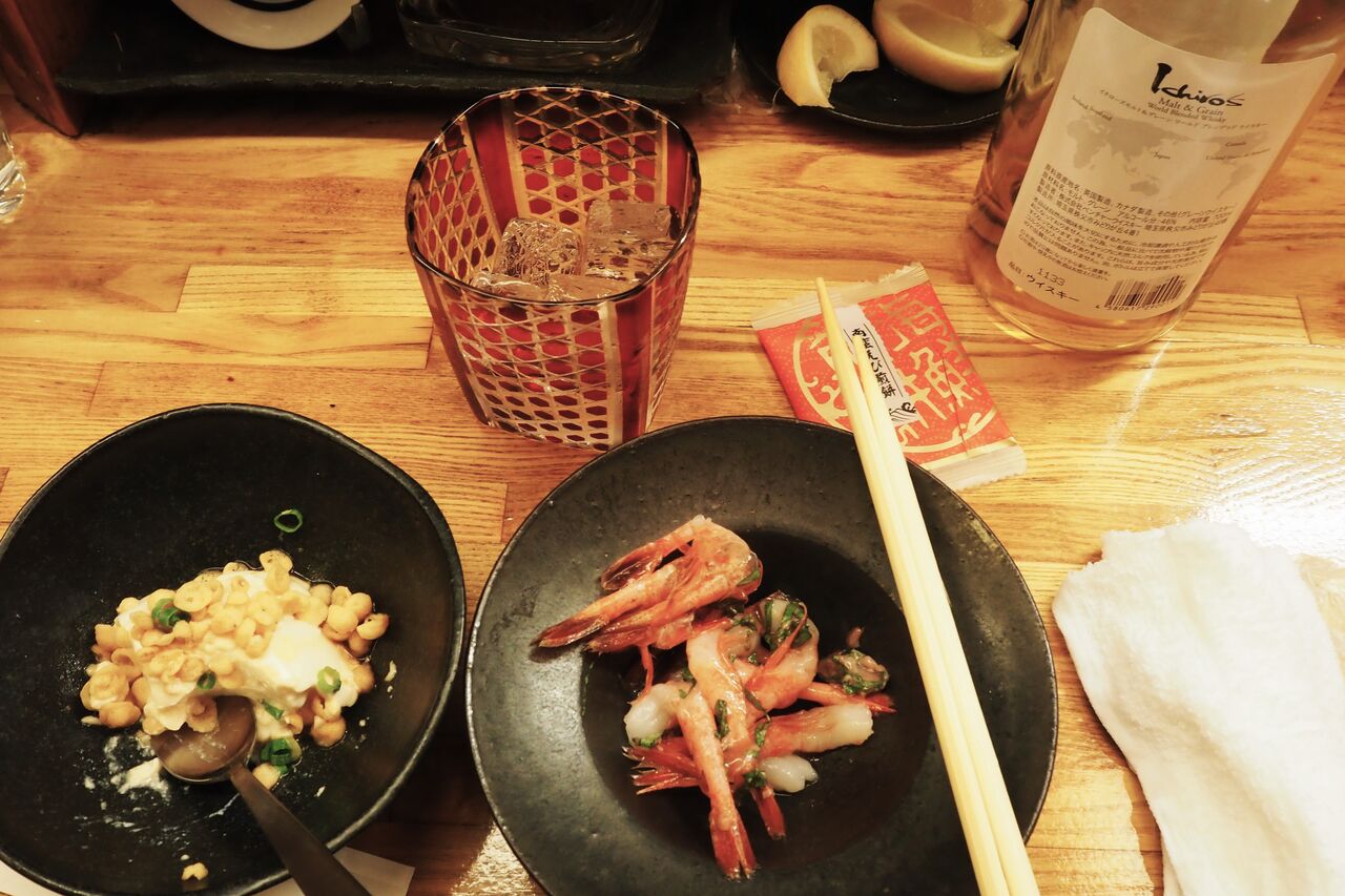 写真は天カスを乗せたたぬき豆腐と甘エビの酒盗和え。