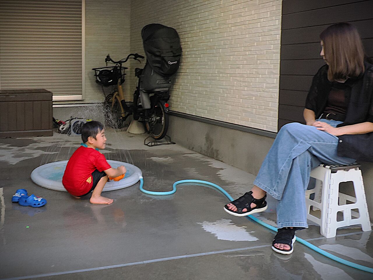 沿道の車庫の中では、男の子がお母さんに見られながらひとり遊び。