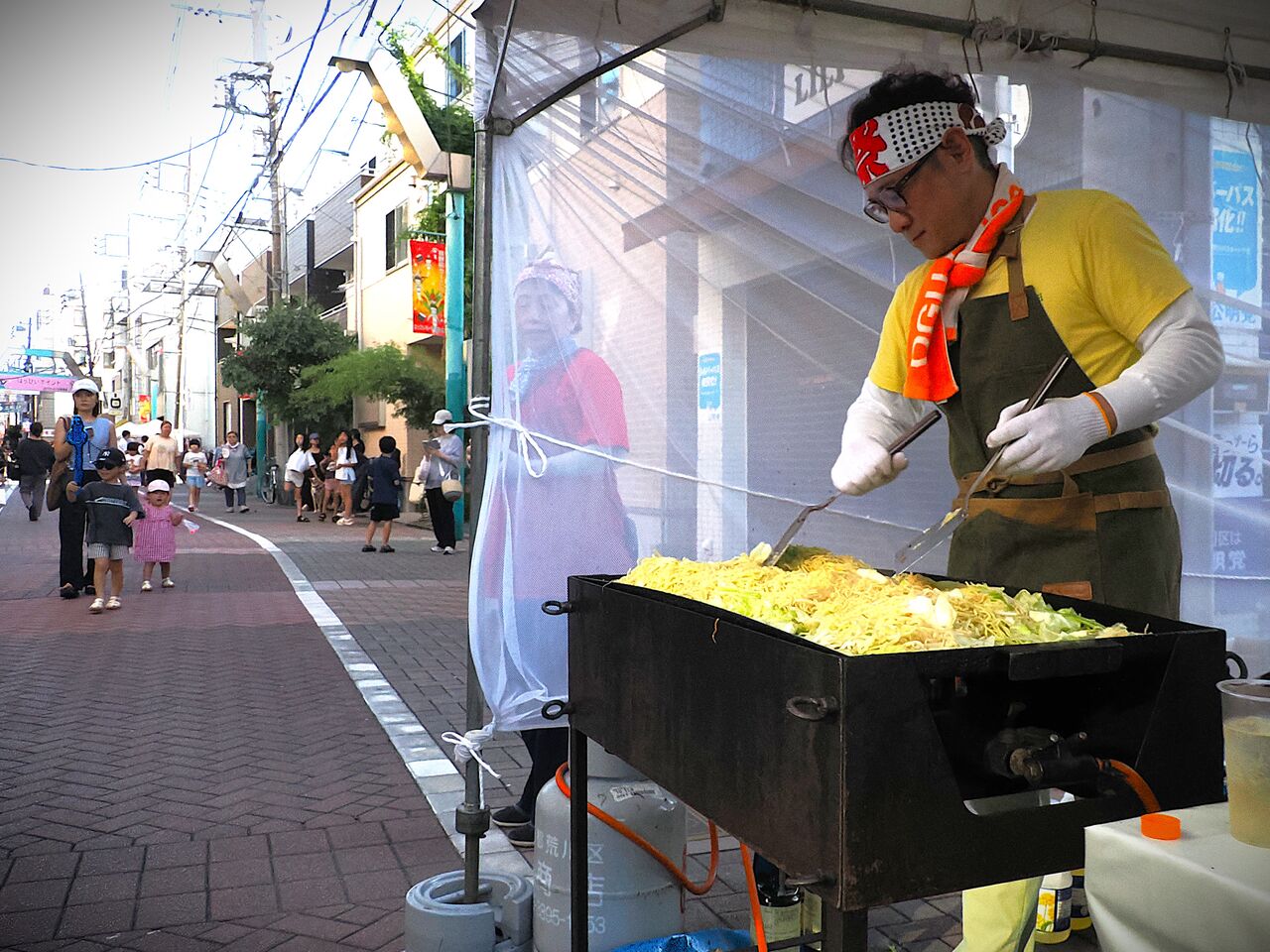 恐らく気温は35℃越え、西日の当たる場所での焼ソバに、汗が入らないのか心配になってしまいました。