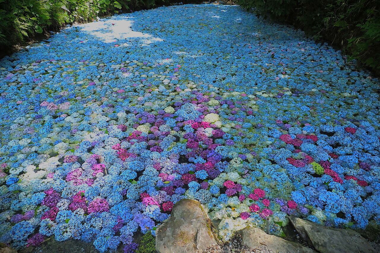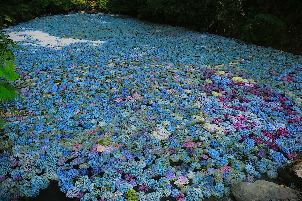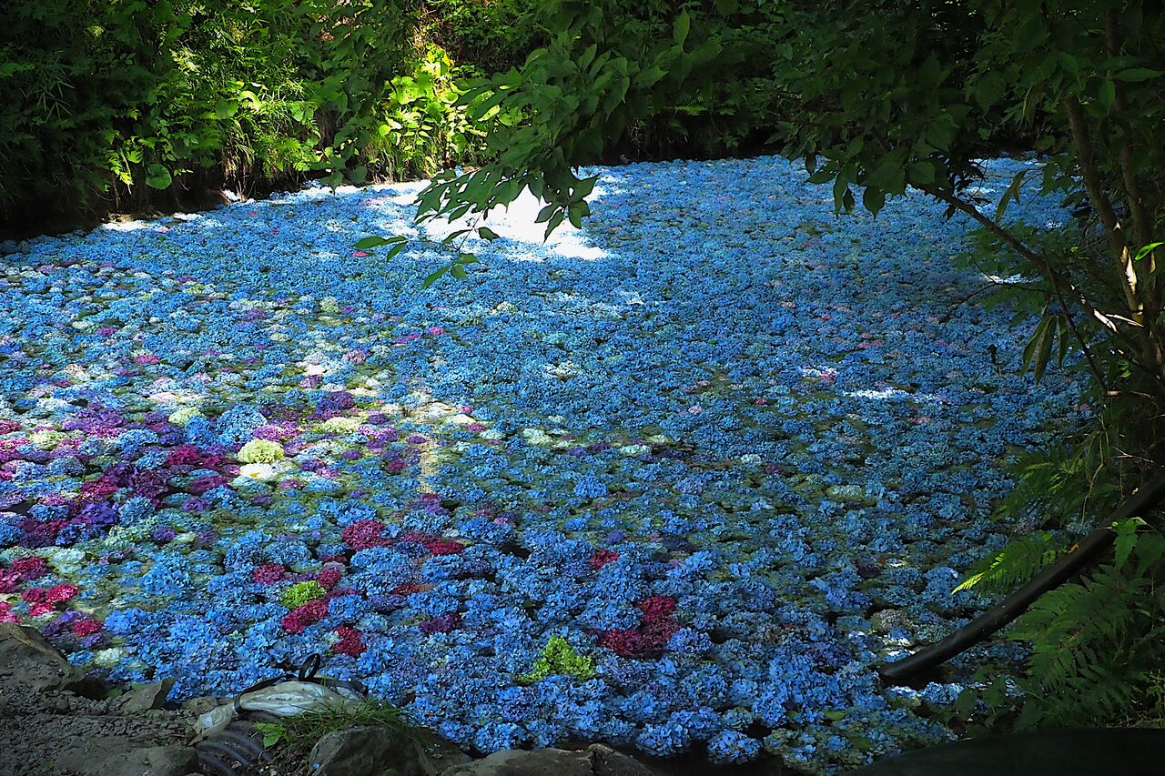 まあ、今はやりの花手水の巨大版と考えればいいのですが、紫陽花の切り花を一個ずつ手作業で浮かべるのです。