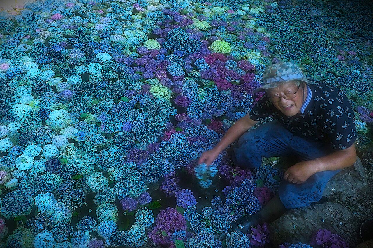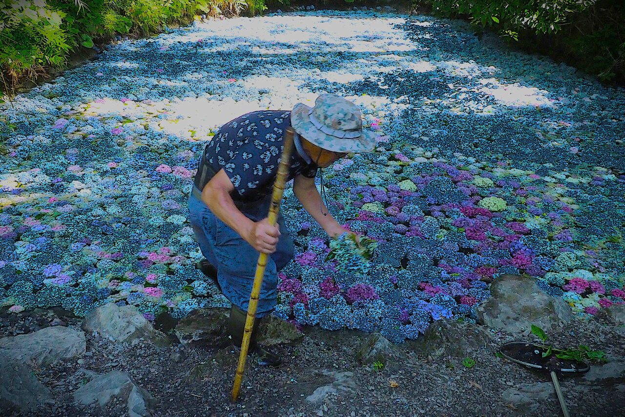 紫陽花の切り花を浮かべているのですが、古くなった切り花を交換補充してくれている紫陽花守りのじいちゃんがいます。