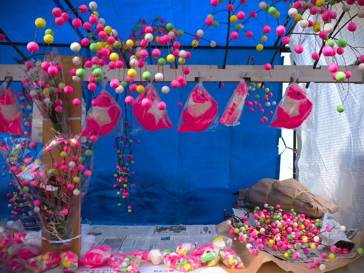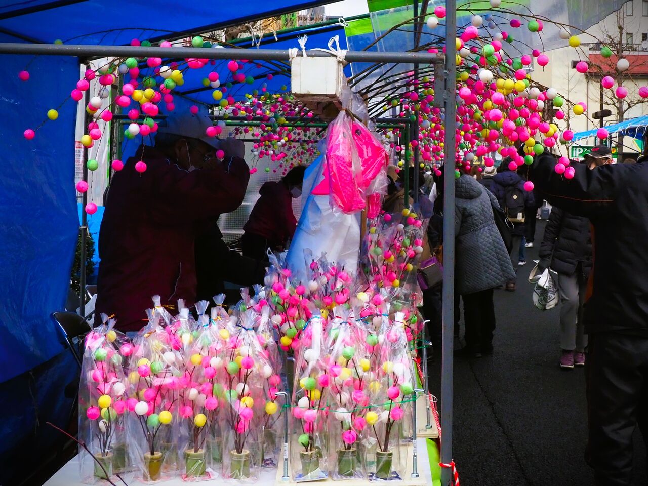 初市で写真になるのは、ブルーシートを背景にした縁起物のだんご木の店だけです。ぼた雪でもボタボタ降ってくれるといいのですが、今年は今のところ雪知らず、でも寒くて底冷えします。