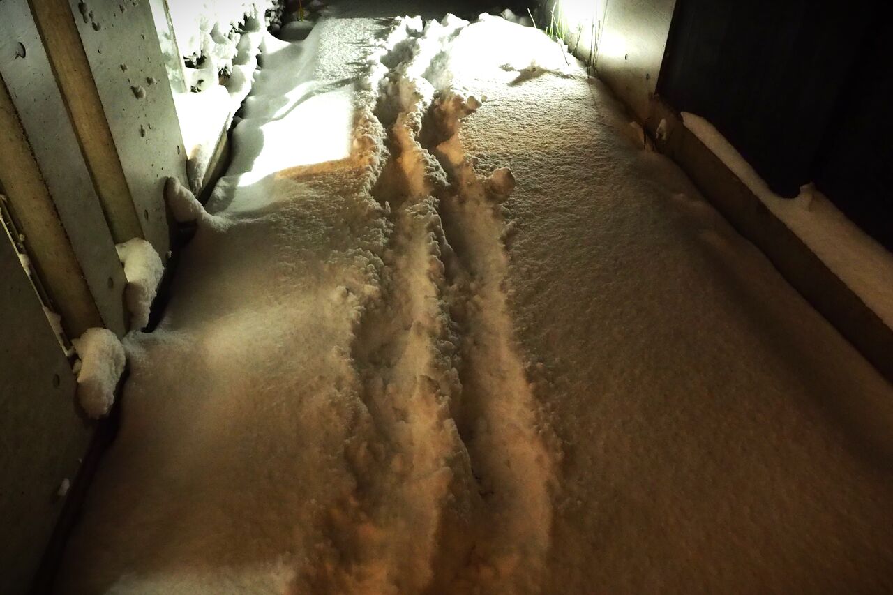 往復エントランスの新雪を踏んだ足跡です。