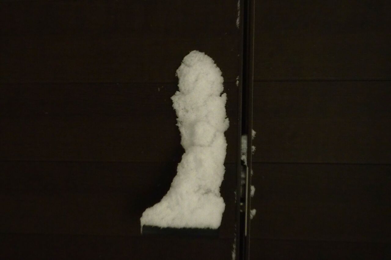 玄関を出て門のハンドル部分にはこんなに積もっています。