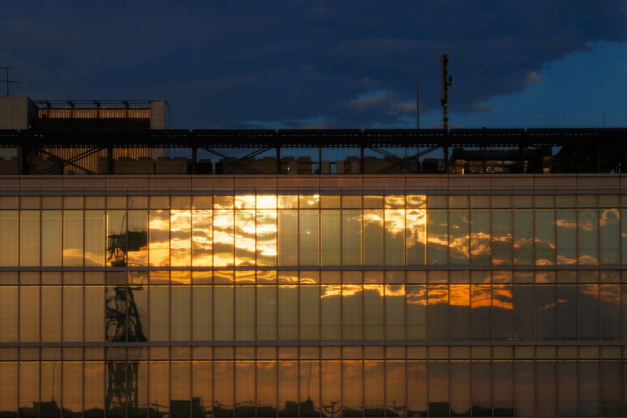 秋分の日まであと3日、日の出の時刻はほぼ6時なので、昨日の朝5時53分の西のヤマダデンキのガラスの壁面も日の出でした。