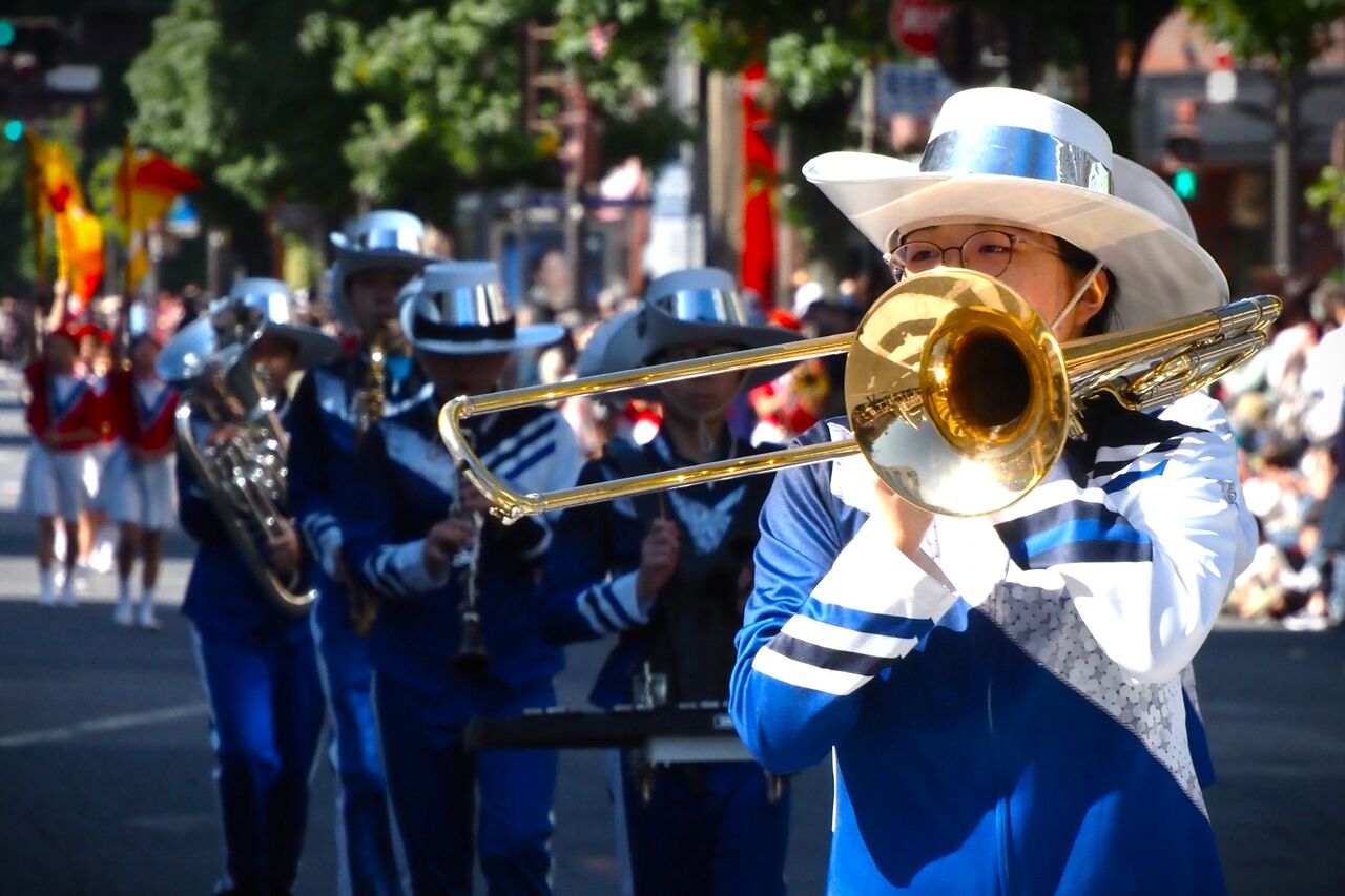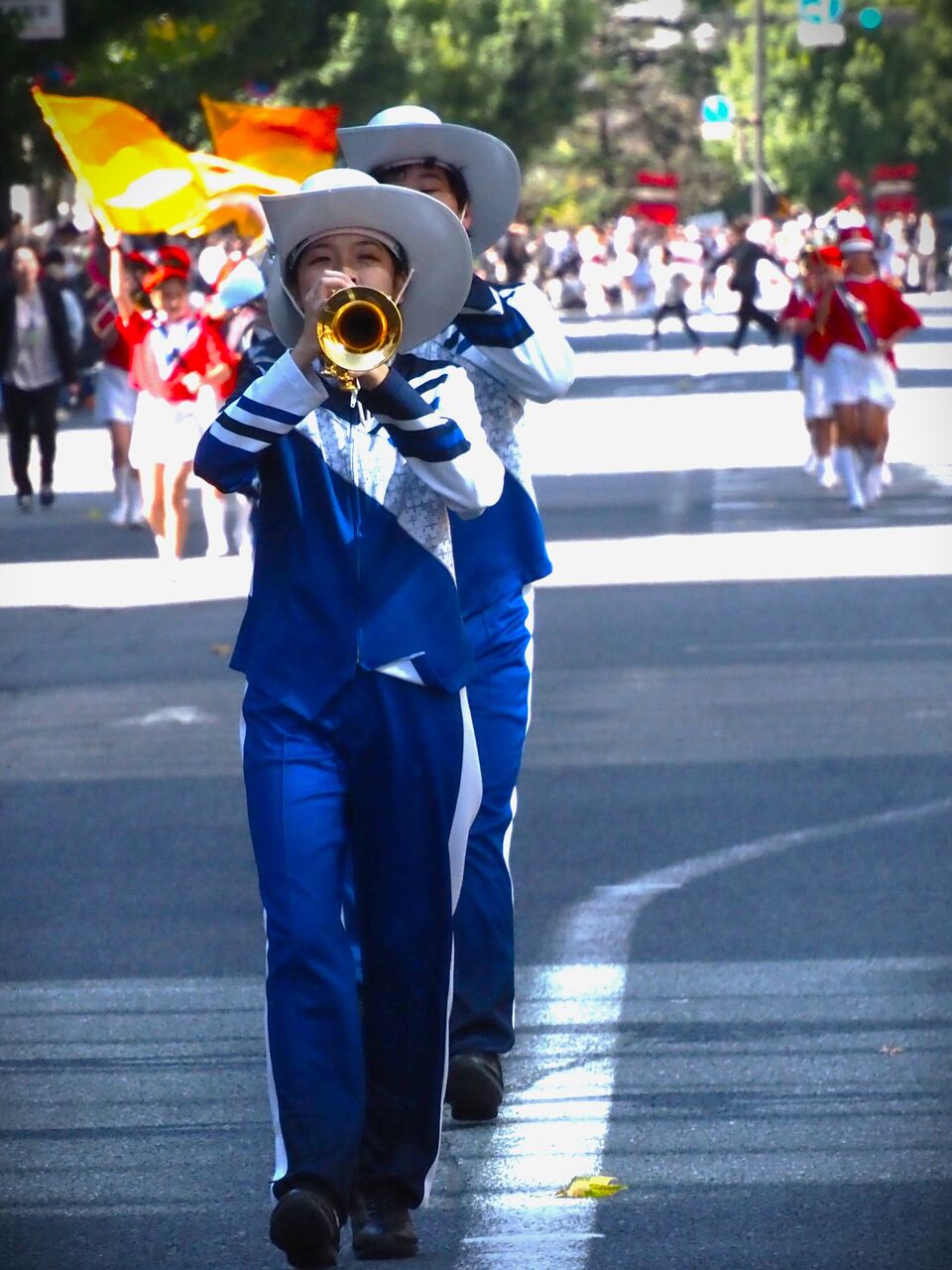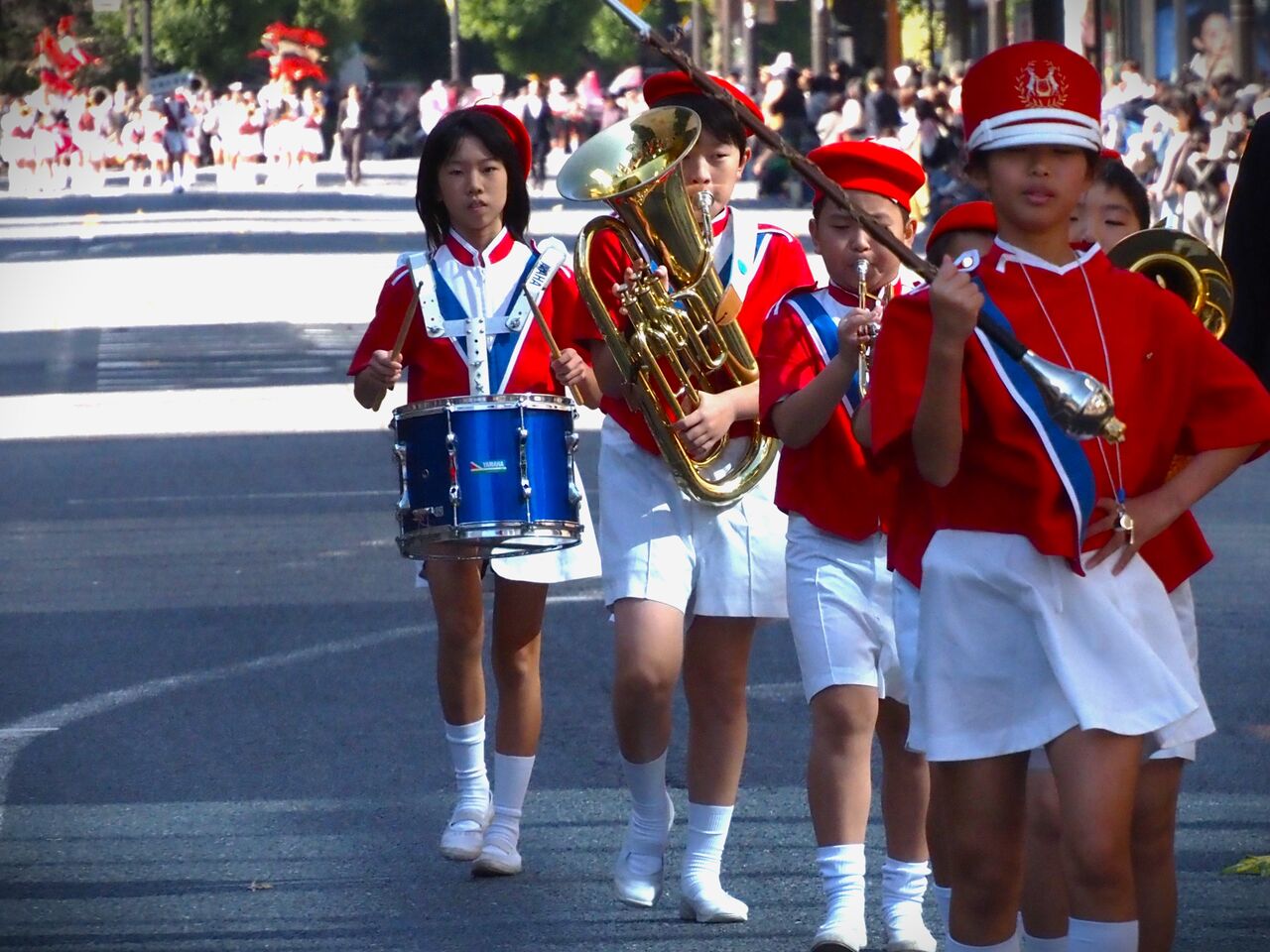 小学生も頑張っていますが、小学生の体力では大きな金管楽器を吹きながらパレードするのは大変そうですな。