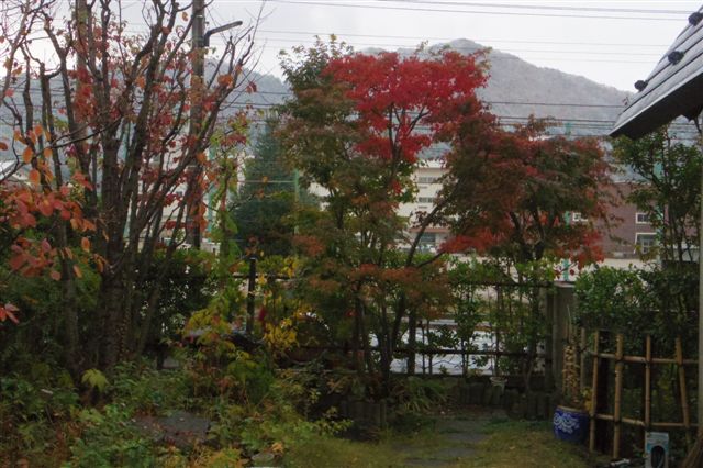 借景の山が白く化粧していますが、我が家のモミジはまだ上のほうしか赤くなっていません。