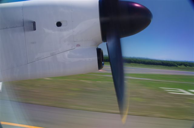 新千歳空港の本当の端っこまでバスで移動しての搭乗ですが、ちょうどプロペラのそばの席だったので、回転するプロペラをうまく撮ろうとして、シャッター速度をいろいろ変えてみますが、なかなか難しい。