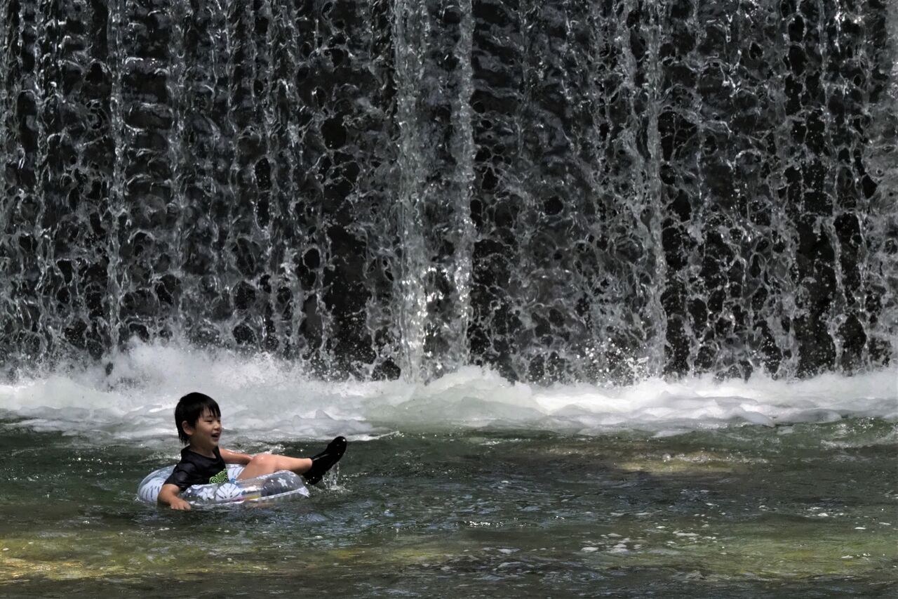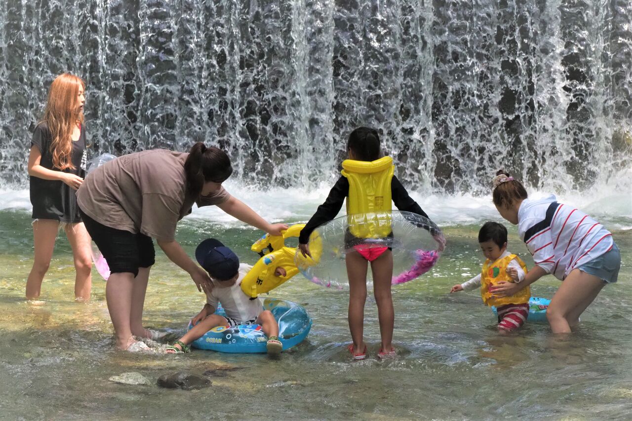 この人工滝の下は天然のクーラーの風が吹き、子供たちの楽園です。