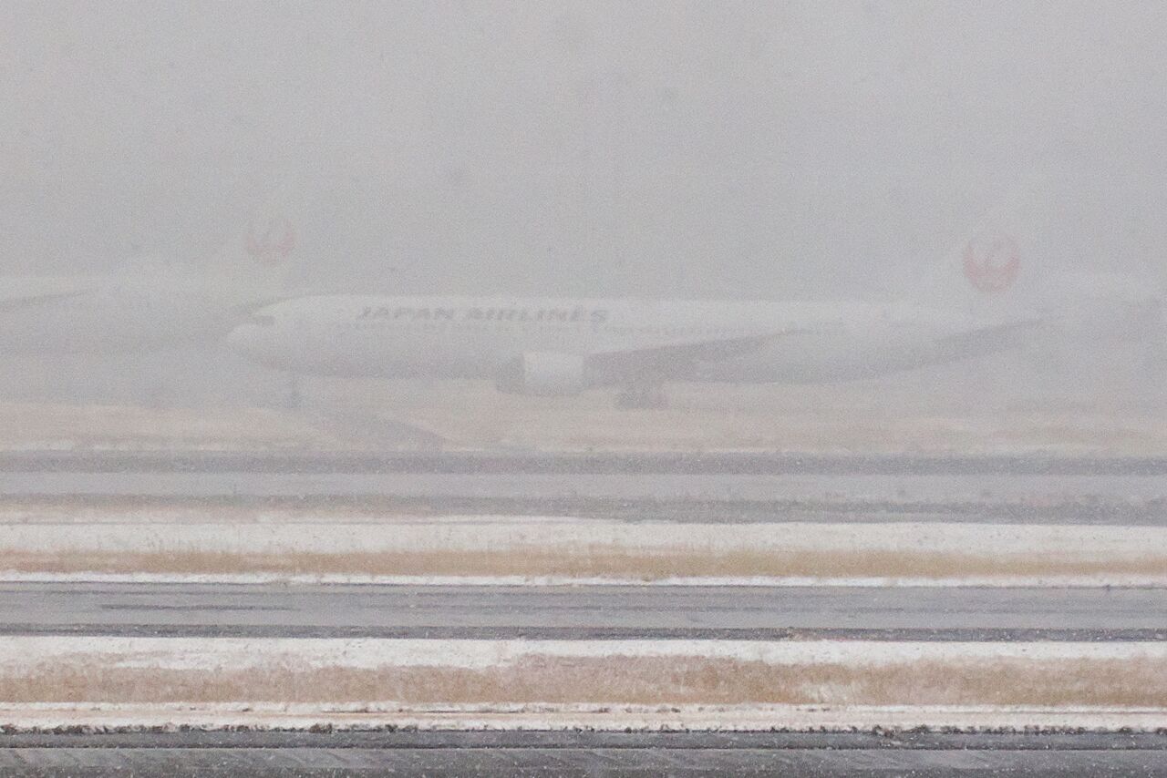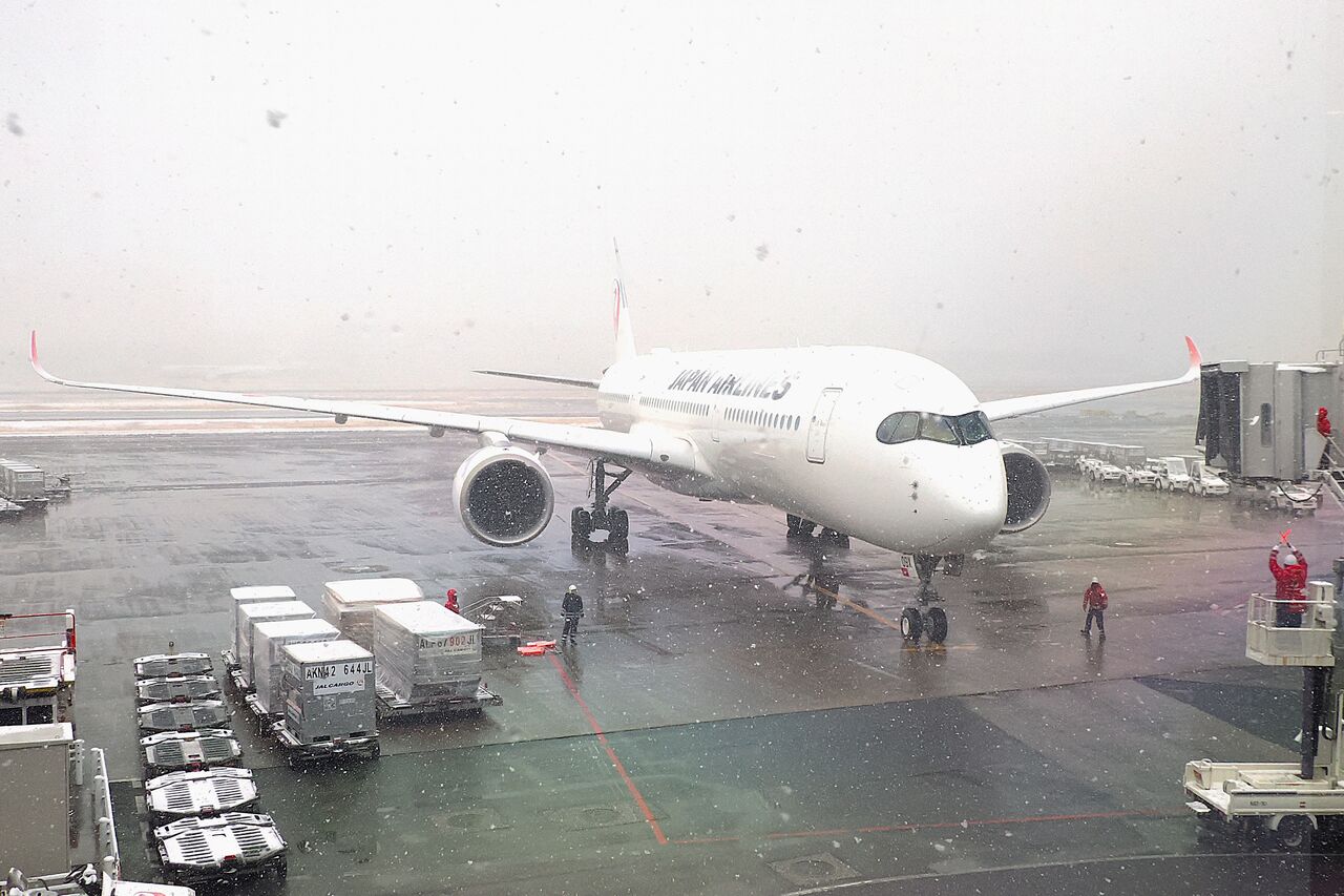 羽田空港は横なぐりの雪、雪の量はそこそこなのですが風があるのでしょう、滑走路もかすんで見えています。時折りホワイトアウトしそうな時もあり。
