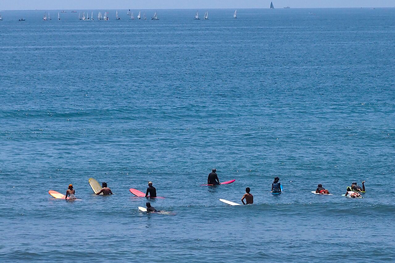 沖ではサーファーたちが、いい波が来るのを待っています。