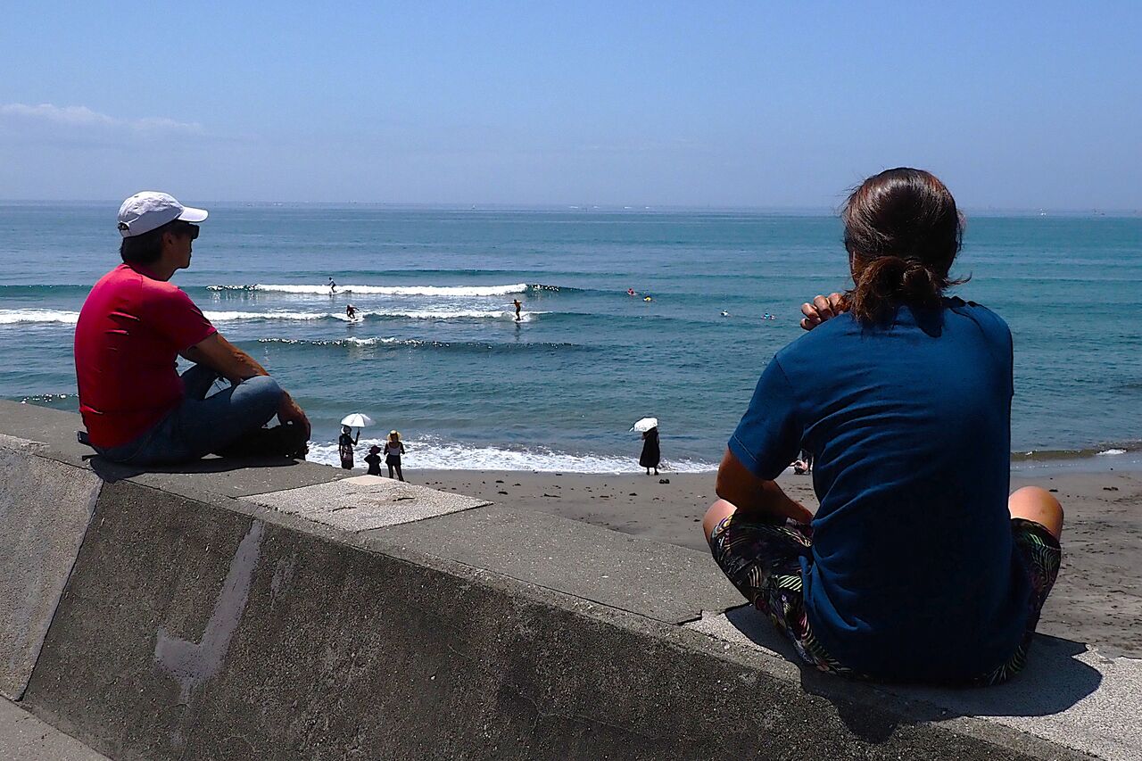 フリマ会場の堤防ではサーフィンを見ている海の男たち。ちょうどサーフィンの大会もあったようです。