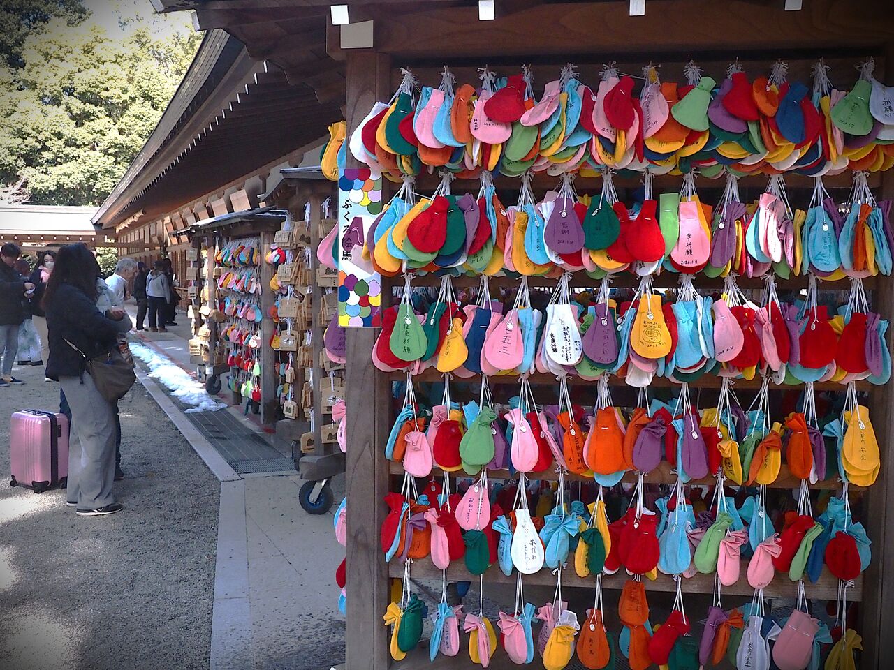 氷川神社では普通の絵馬の他にふくろ絵馬というカラフルな色の絵馬がたくさん奉納されていました。