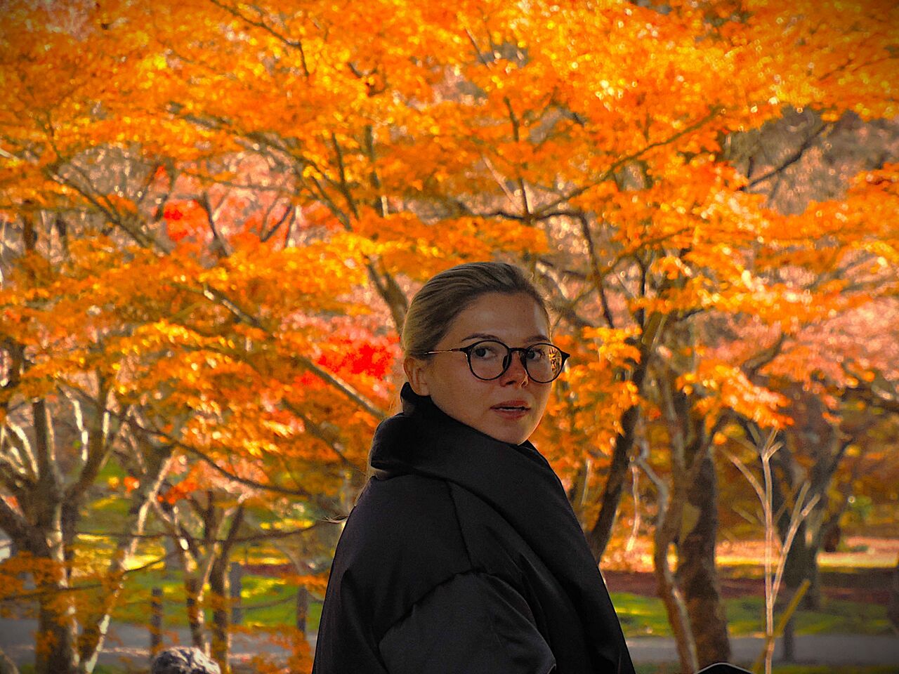 外人さんカップルの1人を引きはがして、紅葉を撮っているふりをしてうしろ姿を狙っていたら、ちょうど振り向いて目線をくれました。