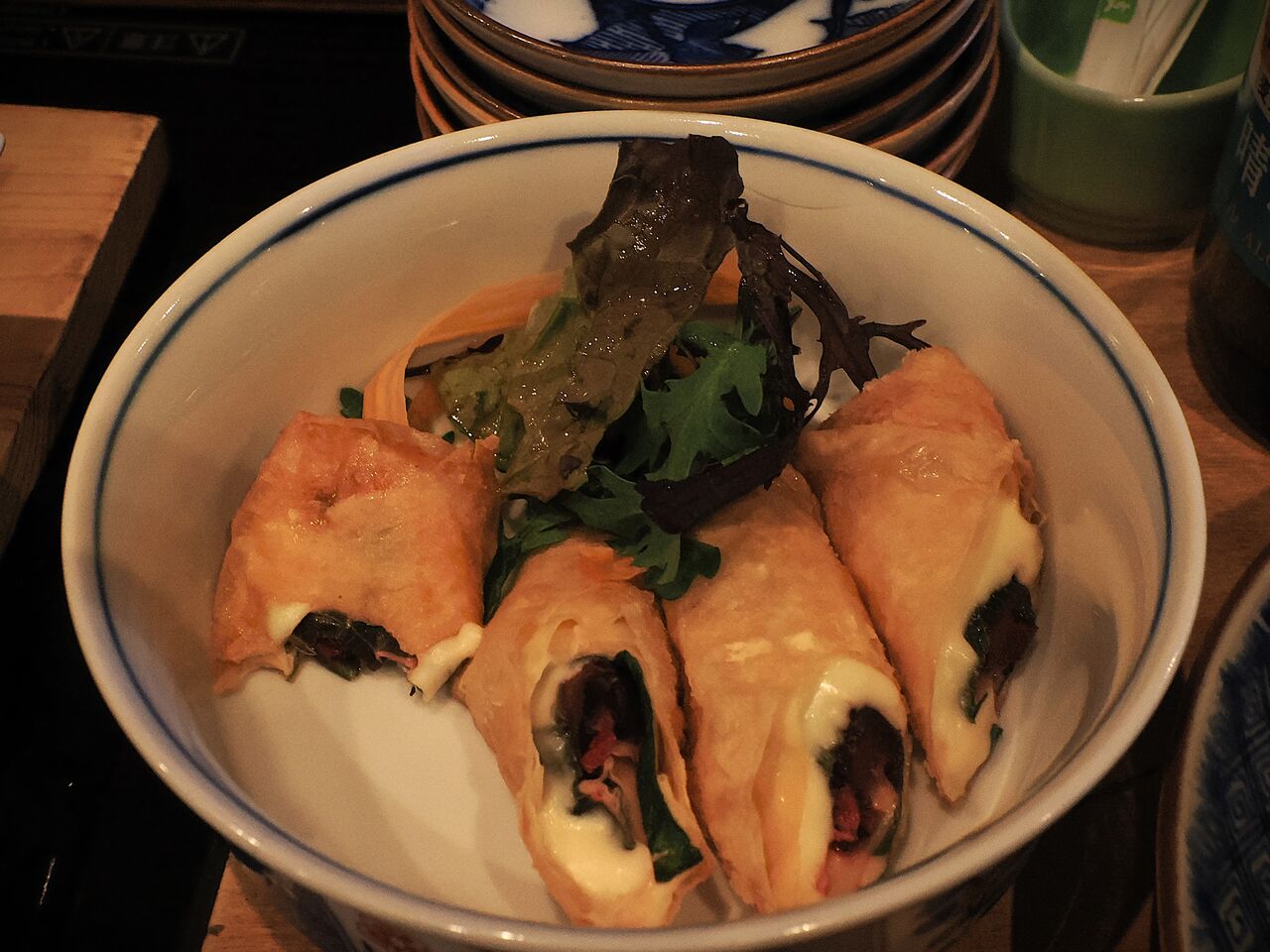 しば漬けをチーズで巻いてそれを春巻きに。なるほど、これならば家でも作れそうです。