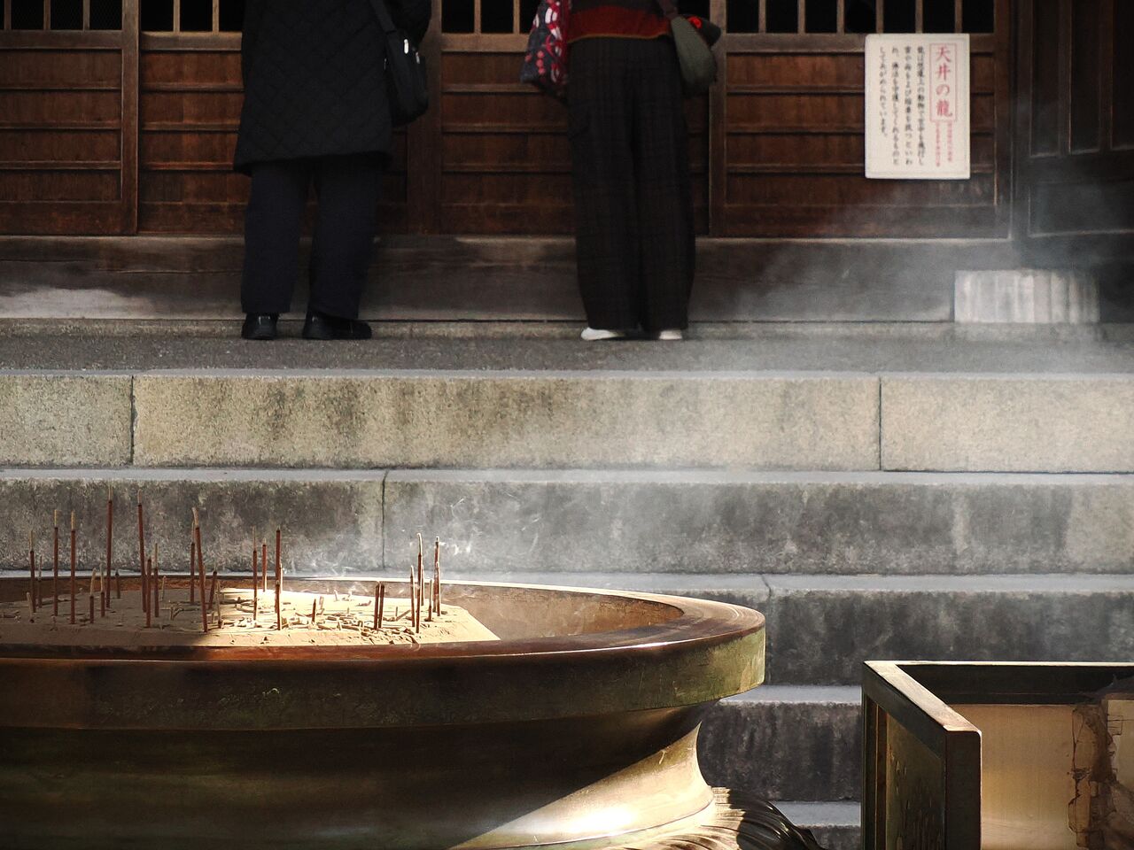 日陰を日差しが切って、そこに線香の煙がたゆたっています。