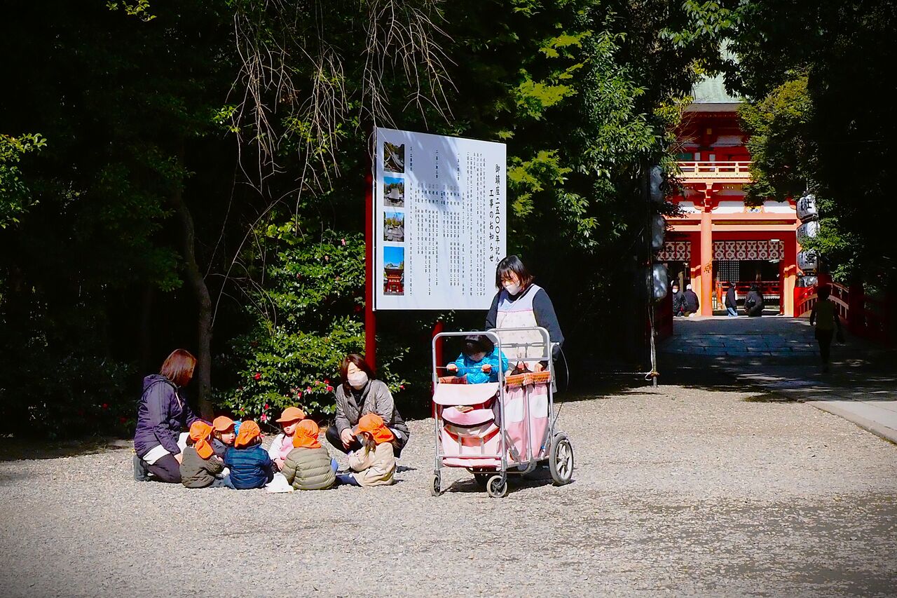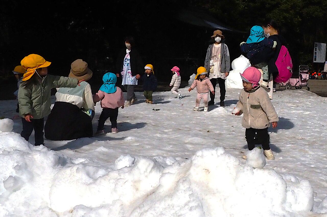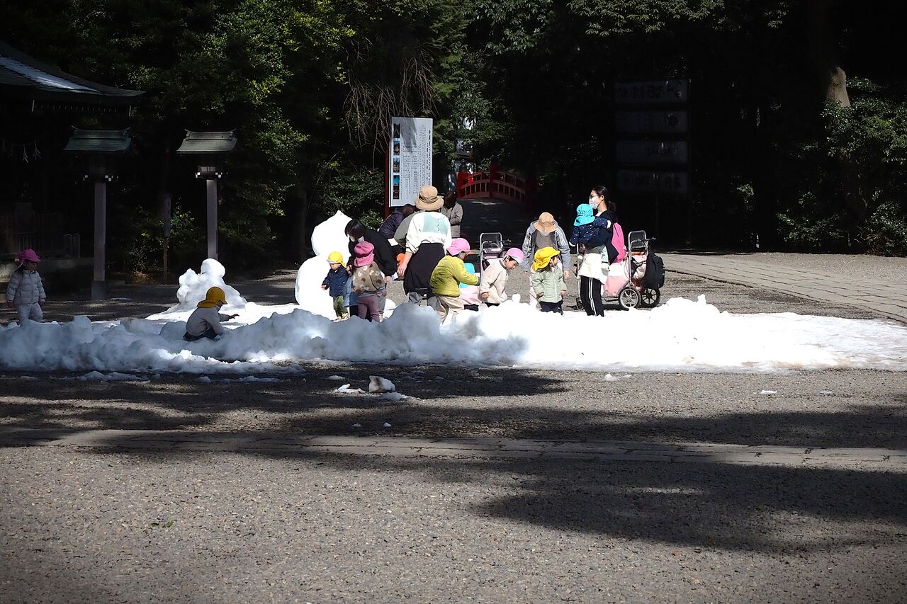 どうやら日曜日の積雪を除雪したのが参道の脇に残っているようで、そこで保育園の園児たちが遊んでいるのでした。