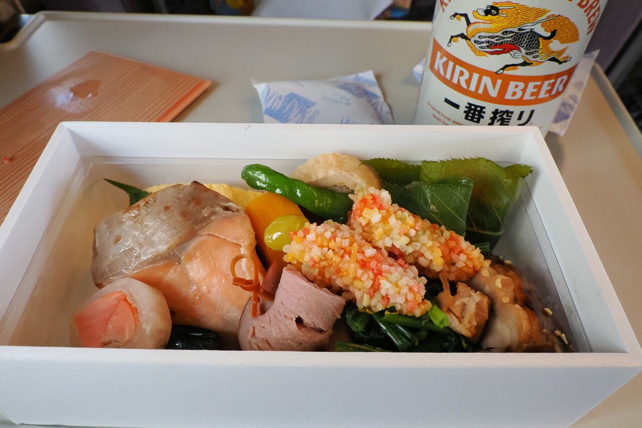 12時33分発なので、伊勢丹デパ地下でほぼつまみだけの老舗弁当を買って、ビールのショート缶も。